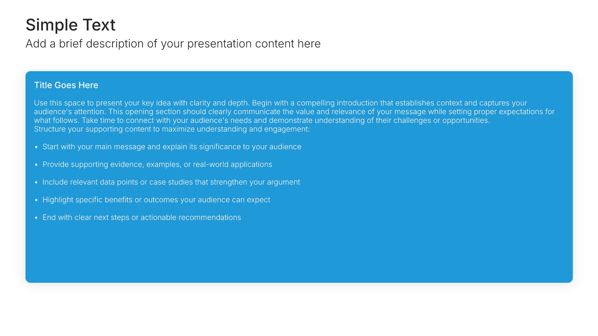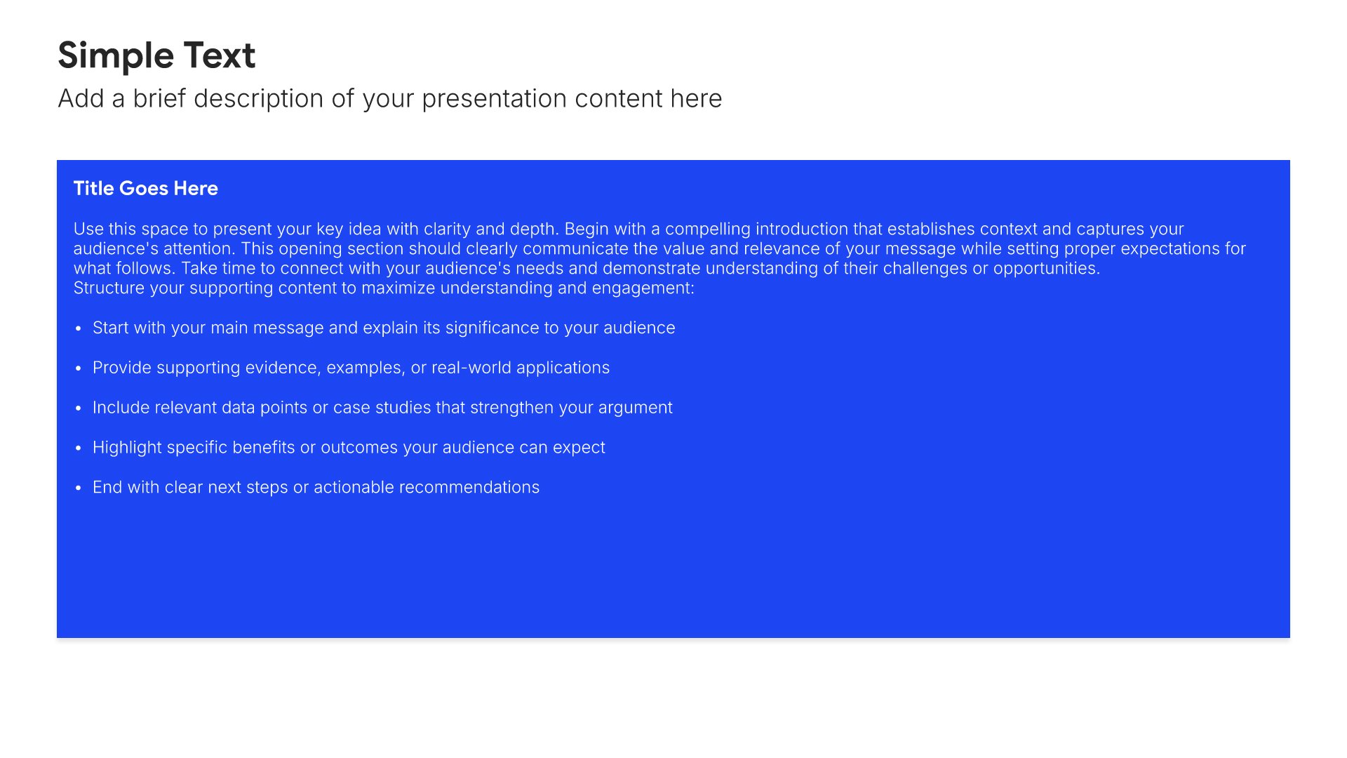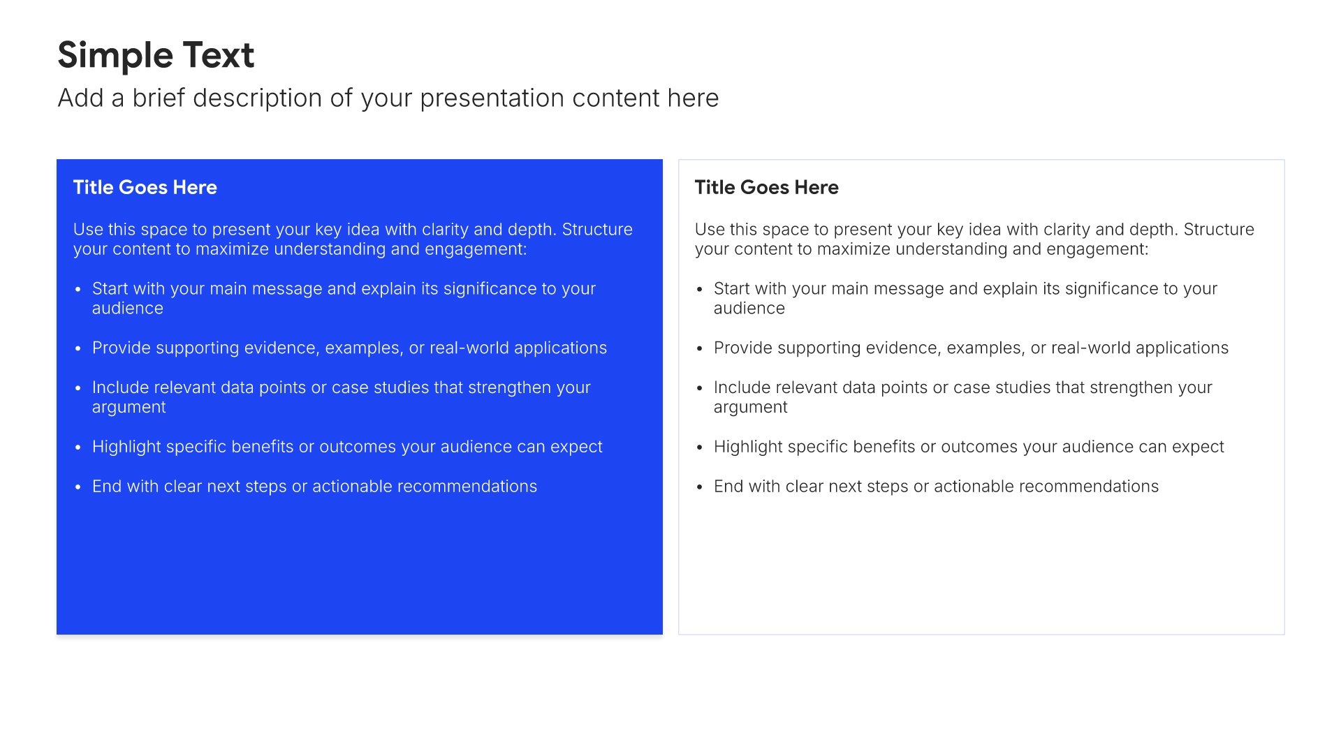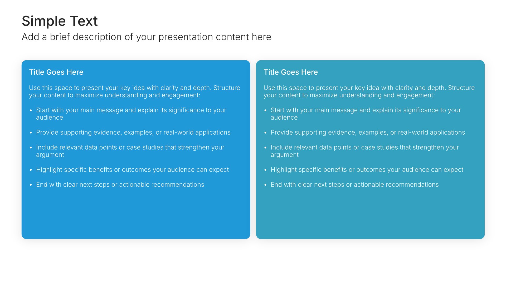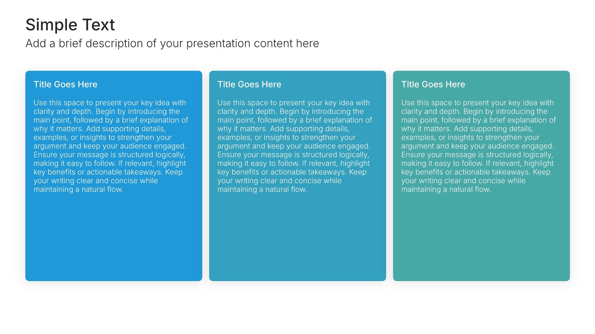 Replace text and image placeholders with your content effortlessly. Customize using tools like Powerpoint, Google Slides, or Keynote and present proudly.
