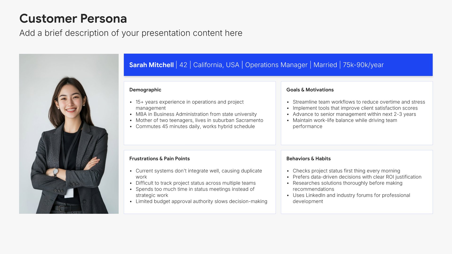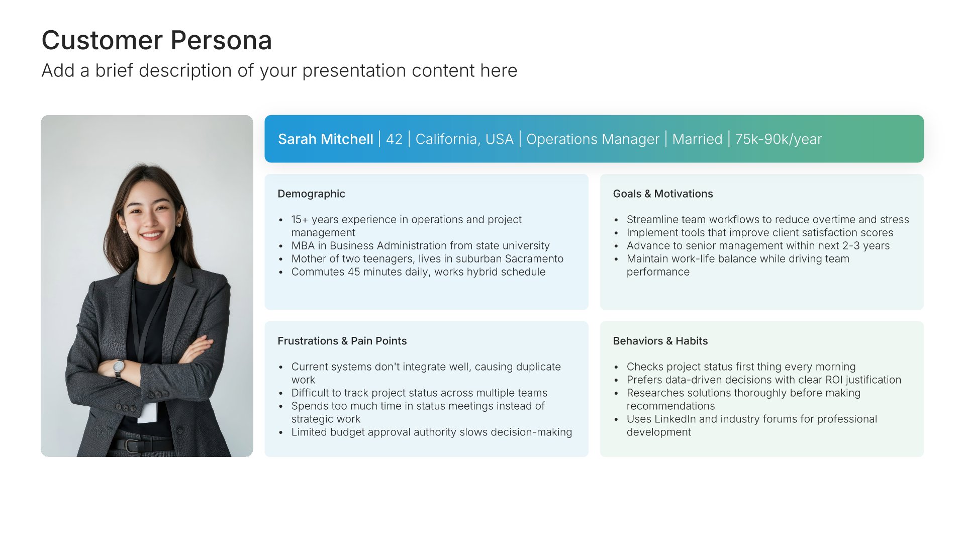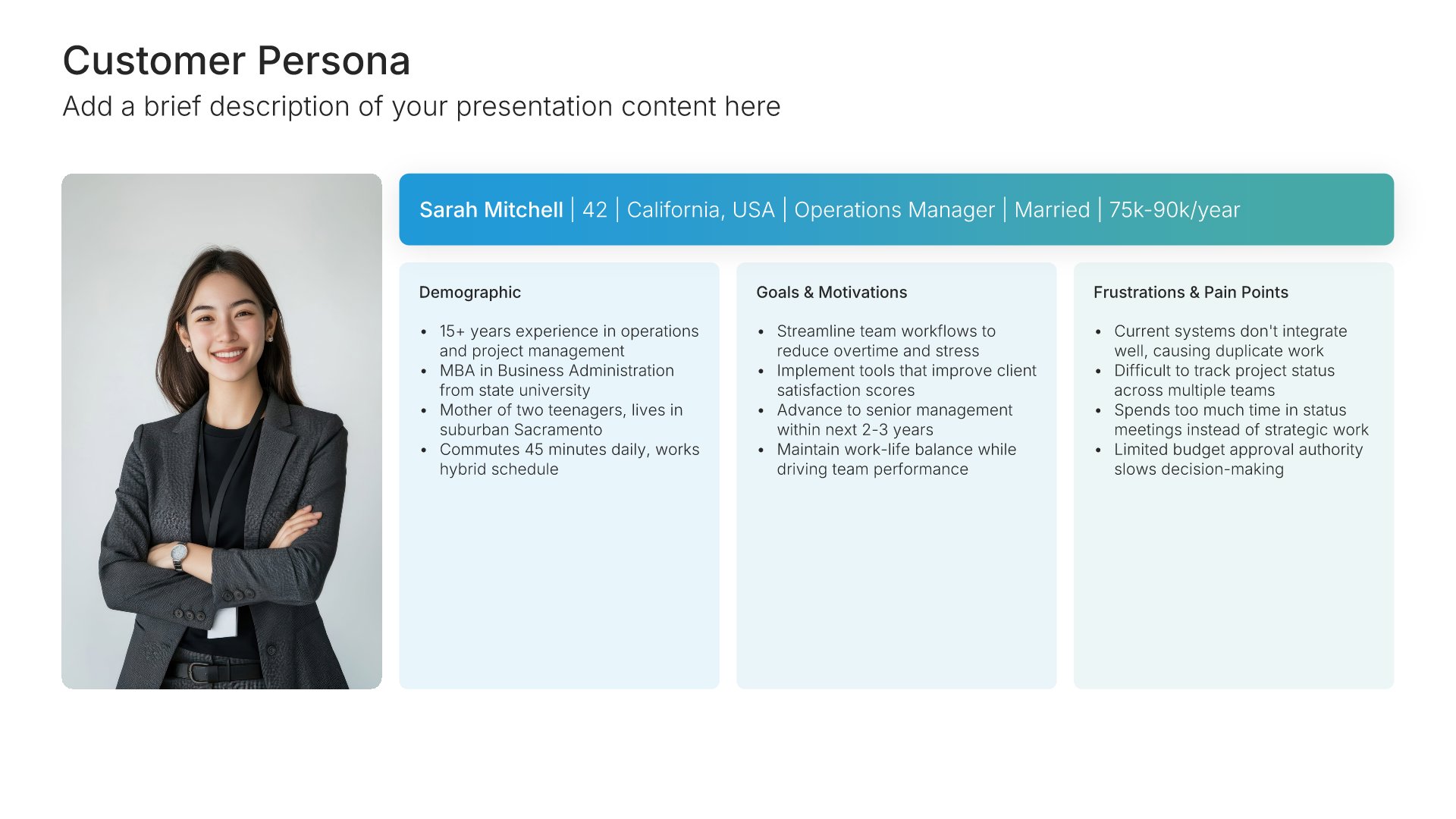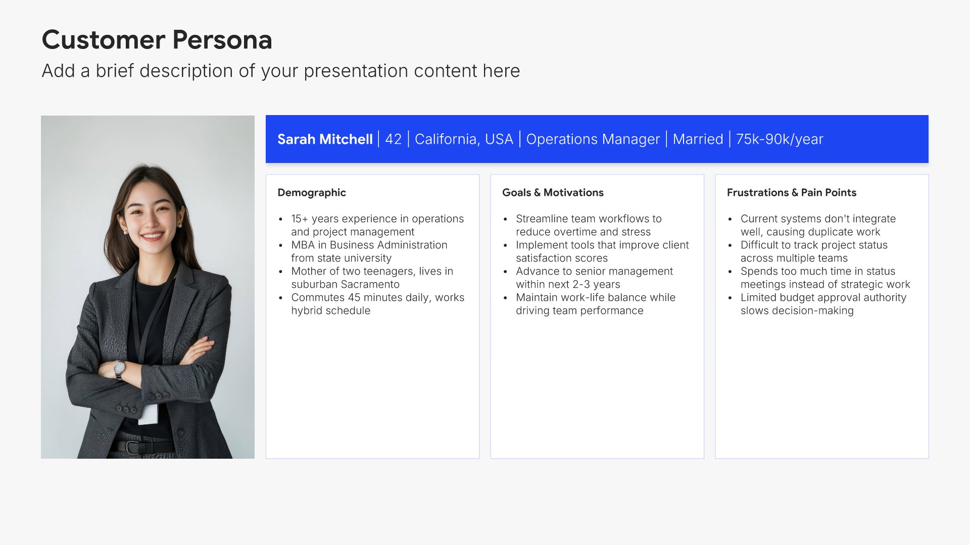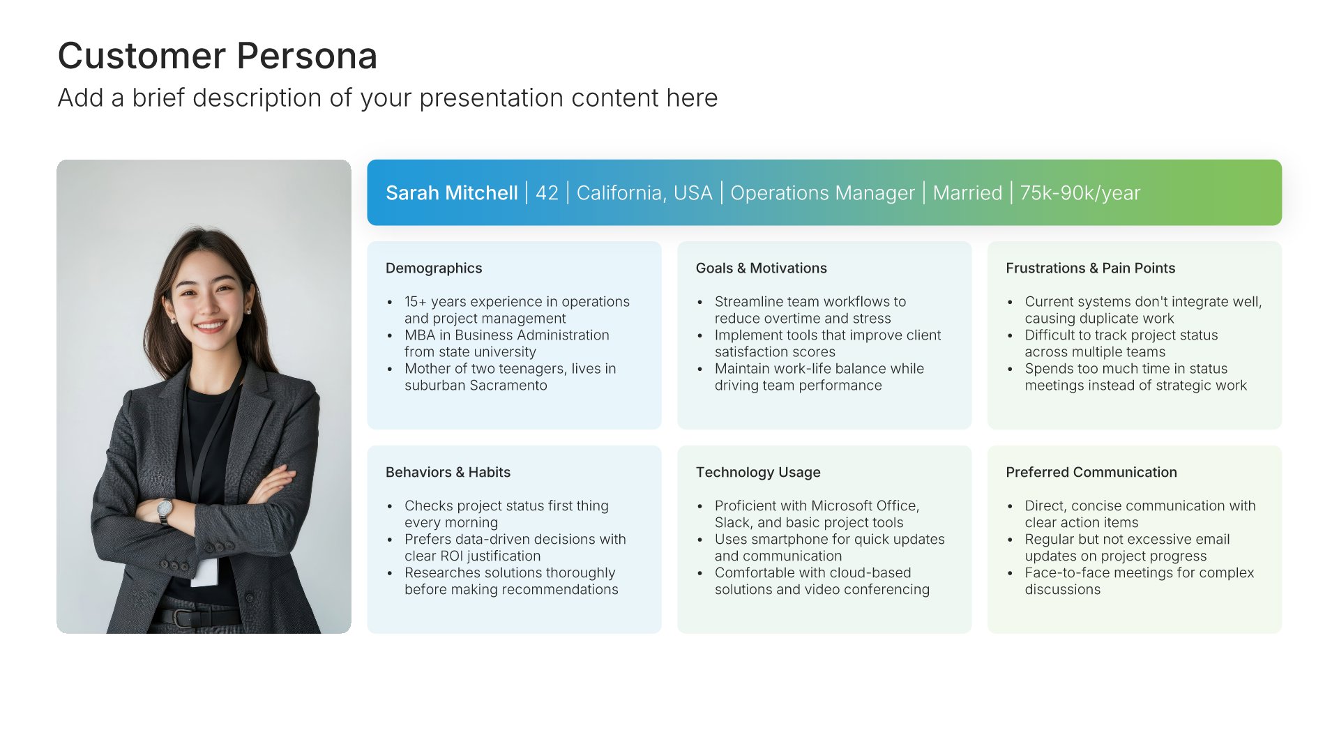Replace text and image placeholders with your content effortlessly. Customize using tools like Powerpoint, Google Slides, or Keynote and present proudly.