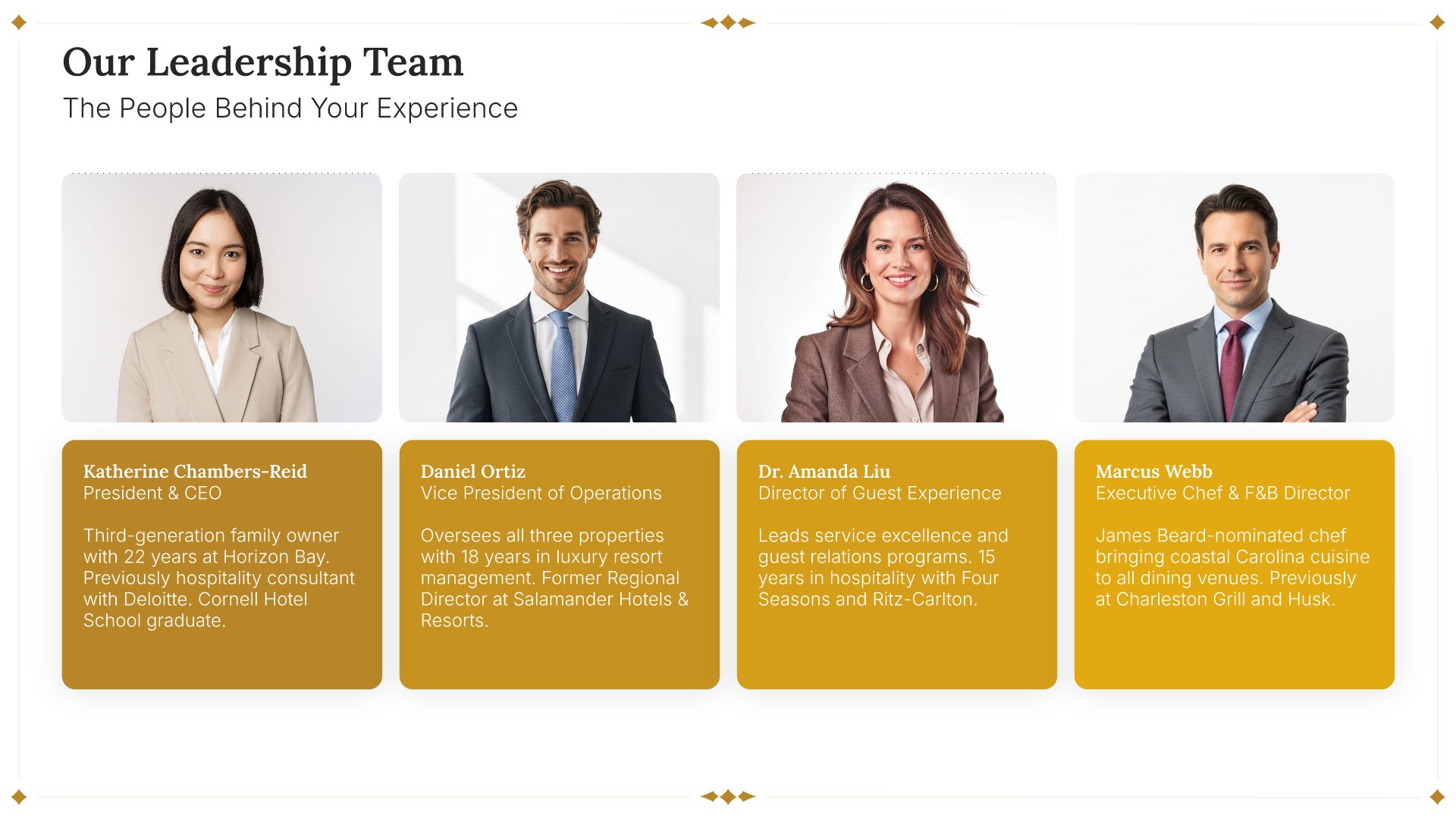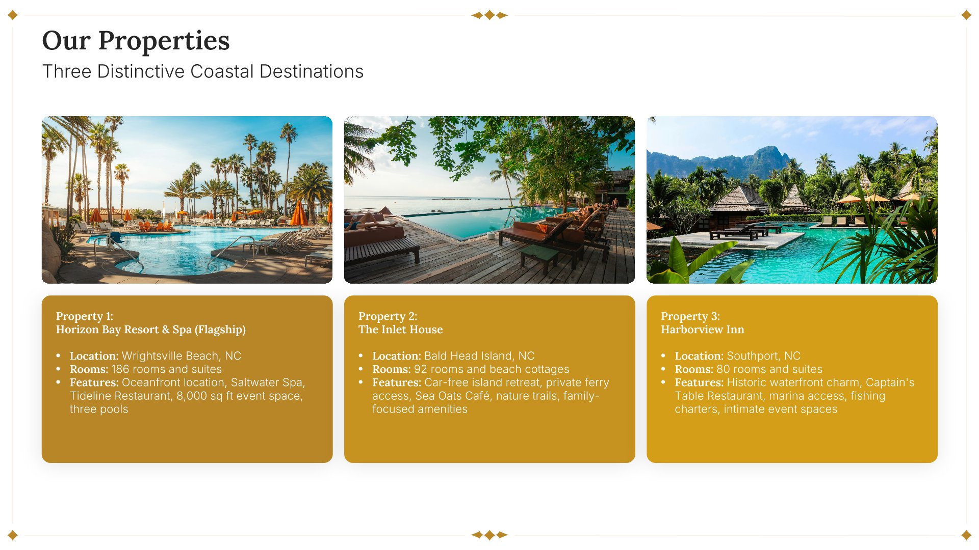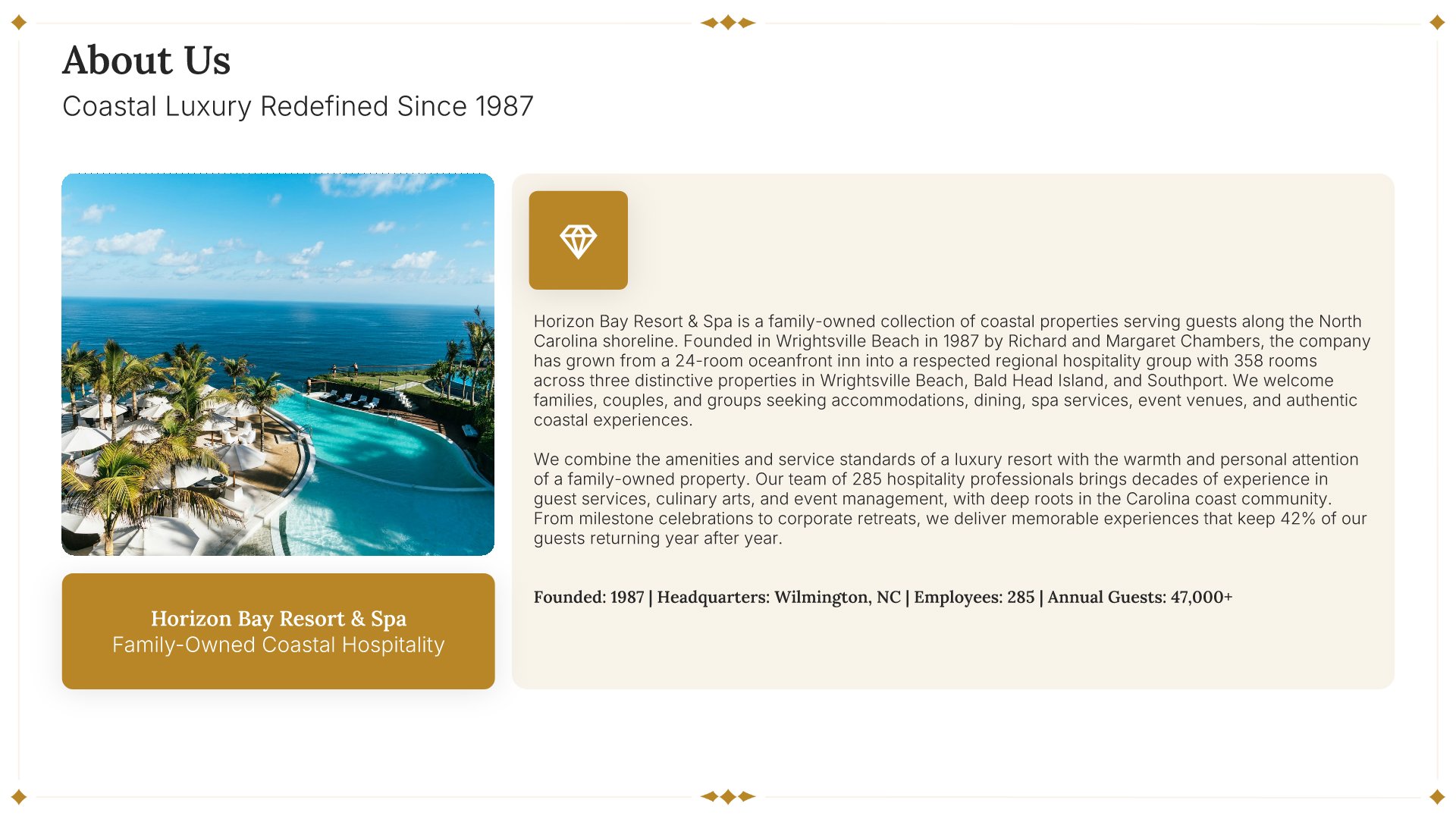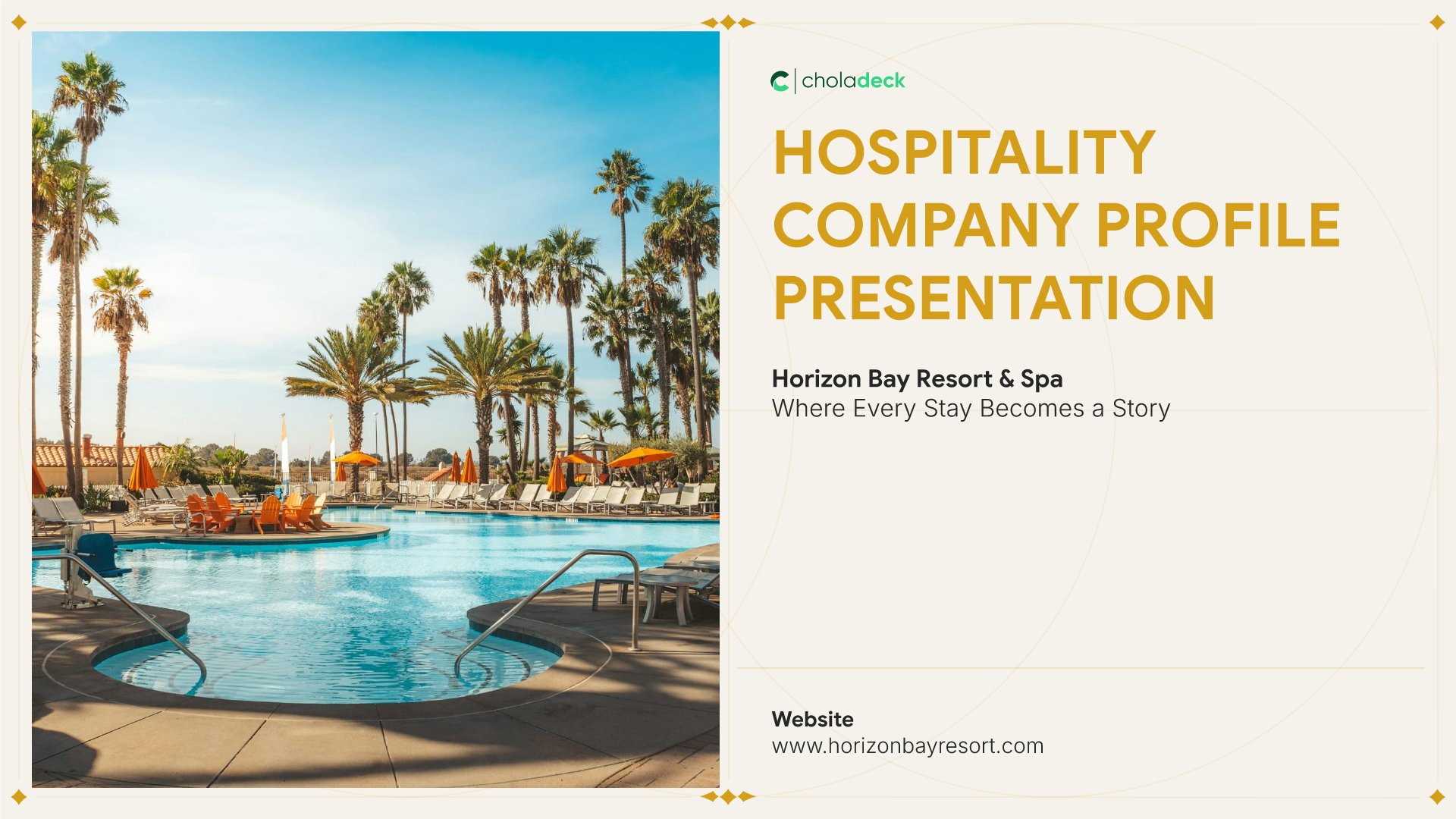 A professionally structured hospitality company profile template following the Universal Company Profile framework adapted for hotels, resorts, and hospitality groups. Built for hospitality businesses showcasing their properties to guests, partners, and investors. Covers story, services, amenities, properties, team credentials, and guest testimonials.