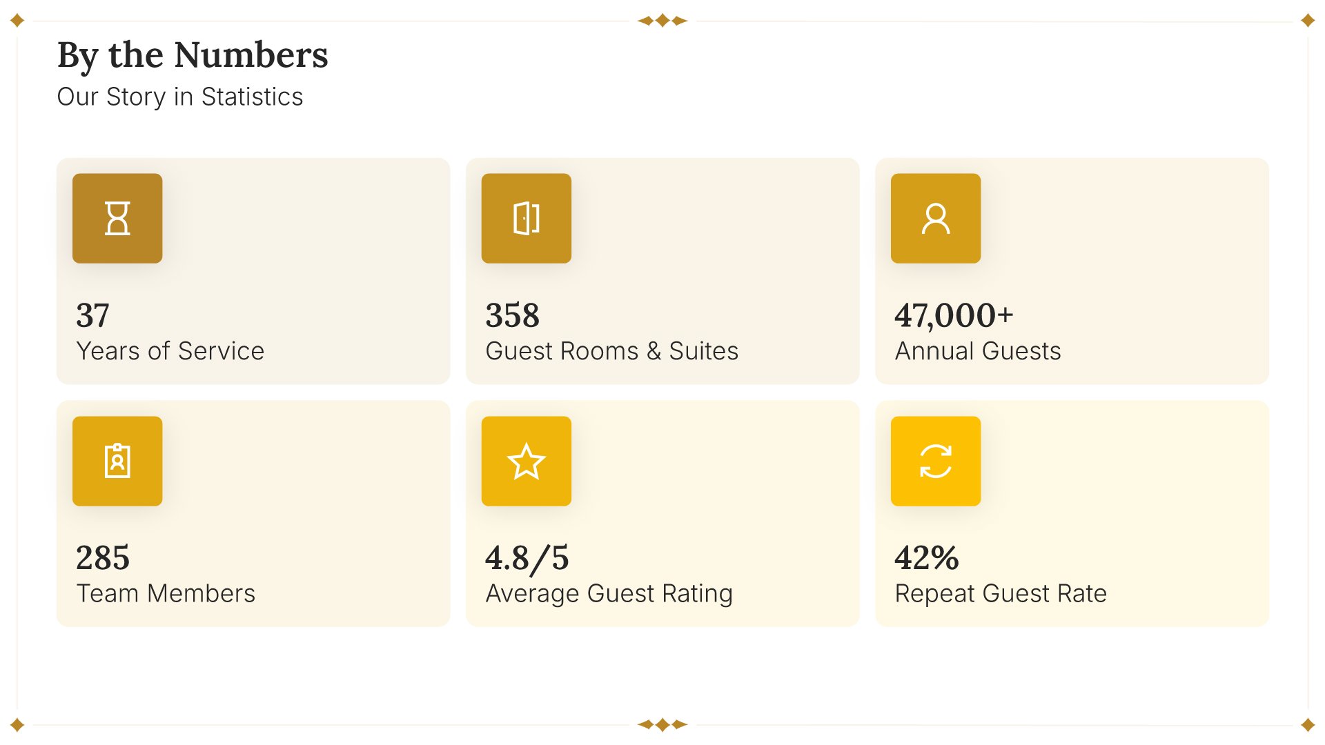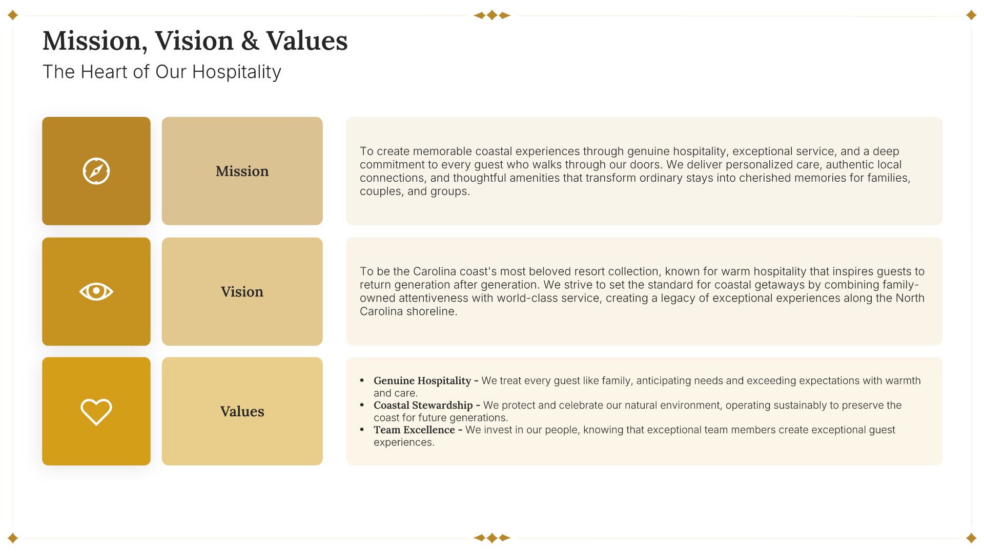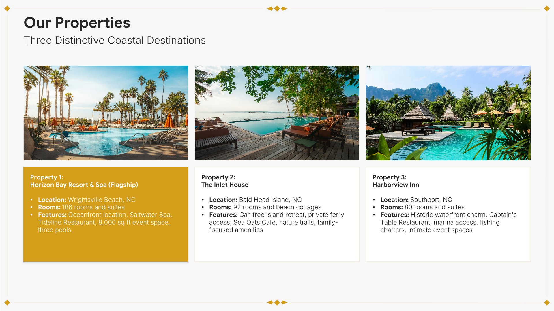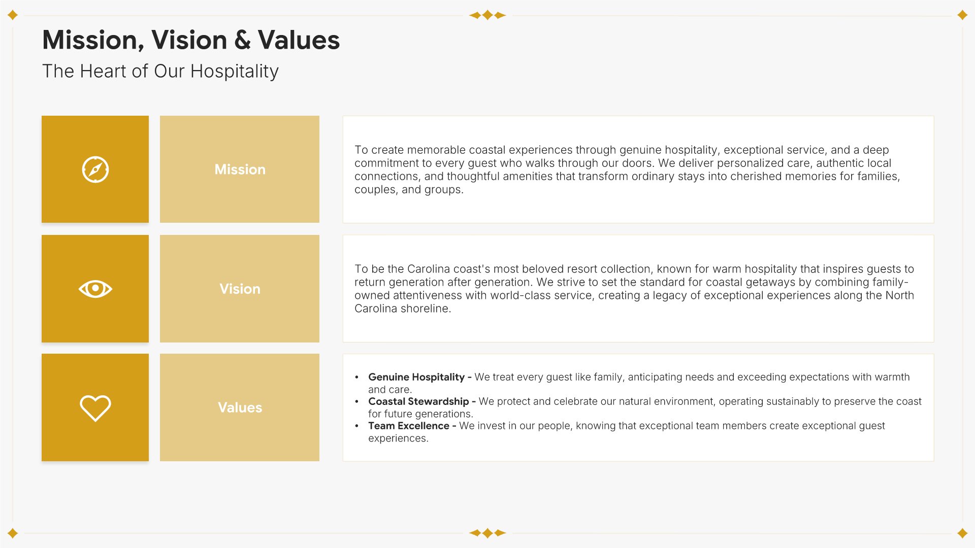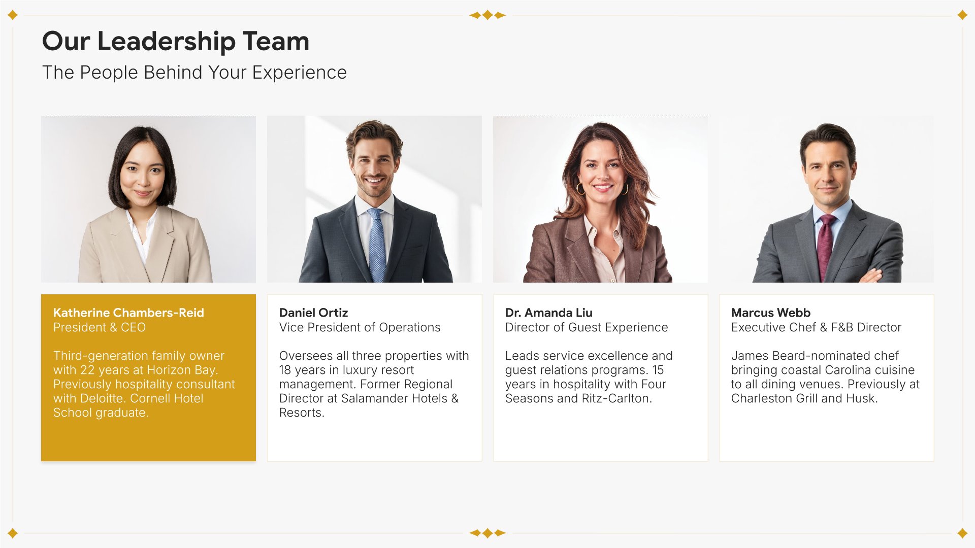 A professionally structured hospitality company profile template following the Universal Company Profile framework adapted for hotels, resorts, and hospitality groups. Built for hospitality businesses showcasing their properties to guests, partners, and investors. Covers story, services, amenities, properties, team credentials, and guest testimonials.