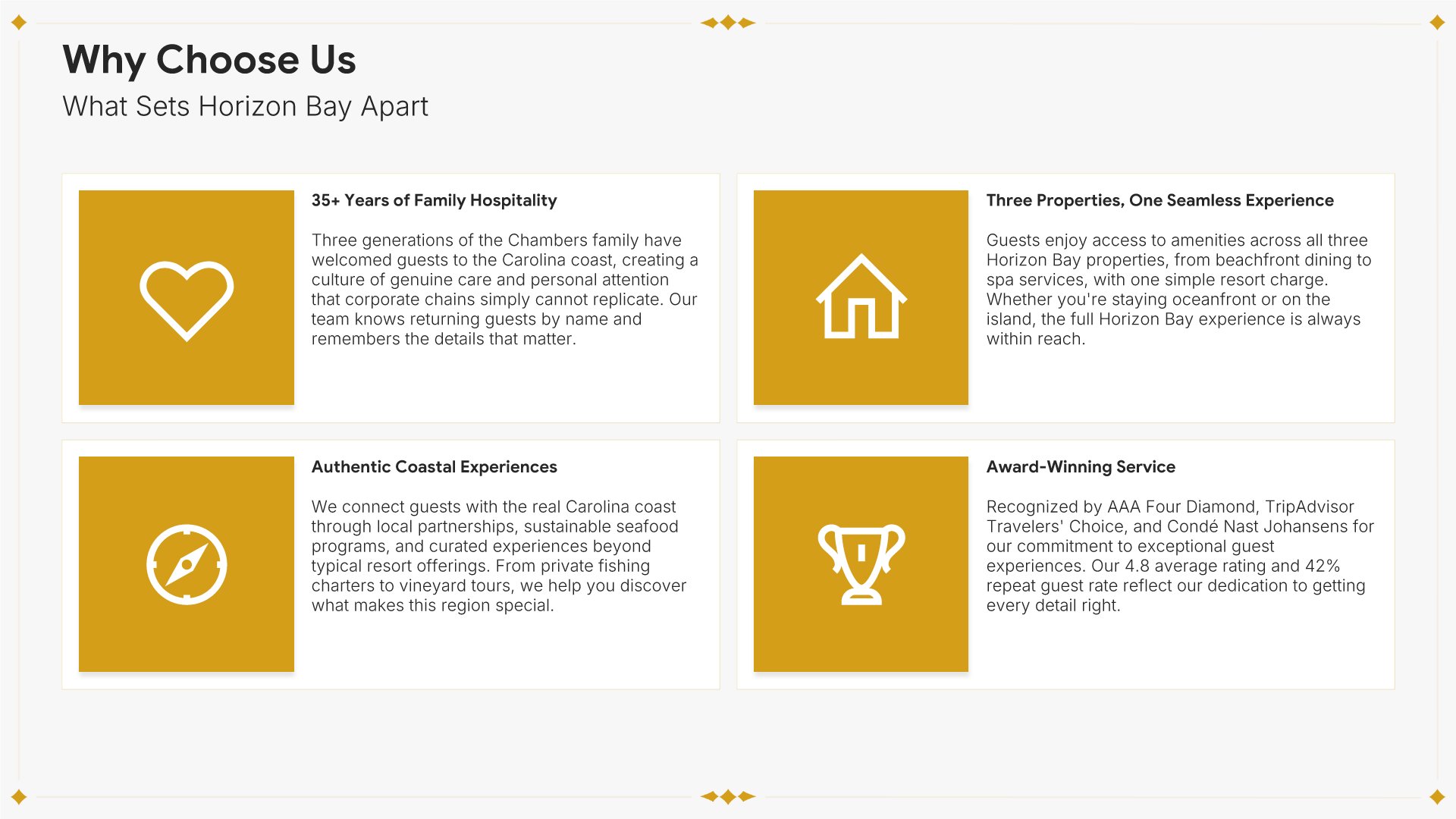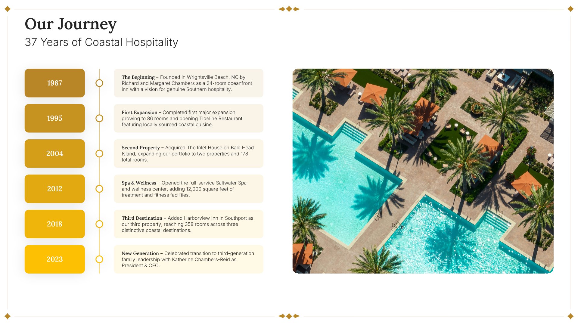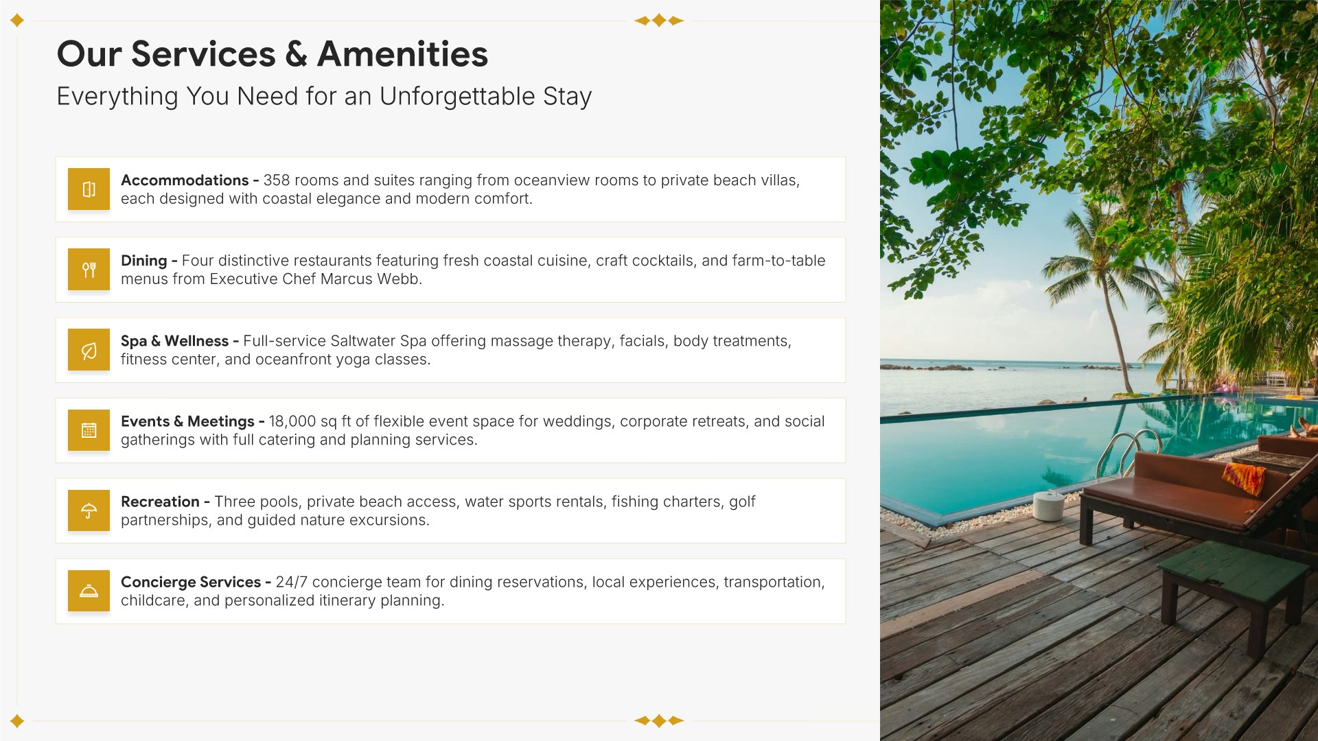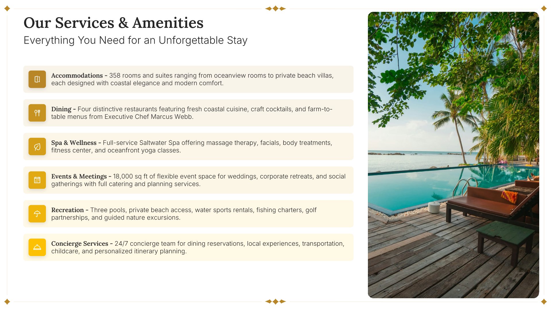 A professionally structured hospitality company profile template following the Universal Company Profile framework adapted for hotels, resorts, and hospitality groups. Built for hospitality businesses showcasing their properties to guests, partners, and investors. Covers story, services, amenities, properties, team credentials, and guest testimonials.