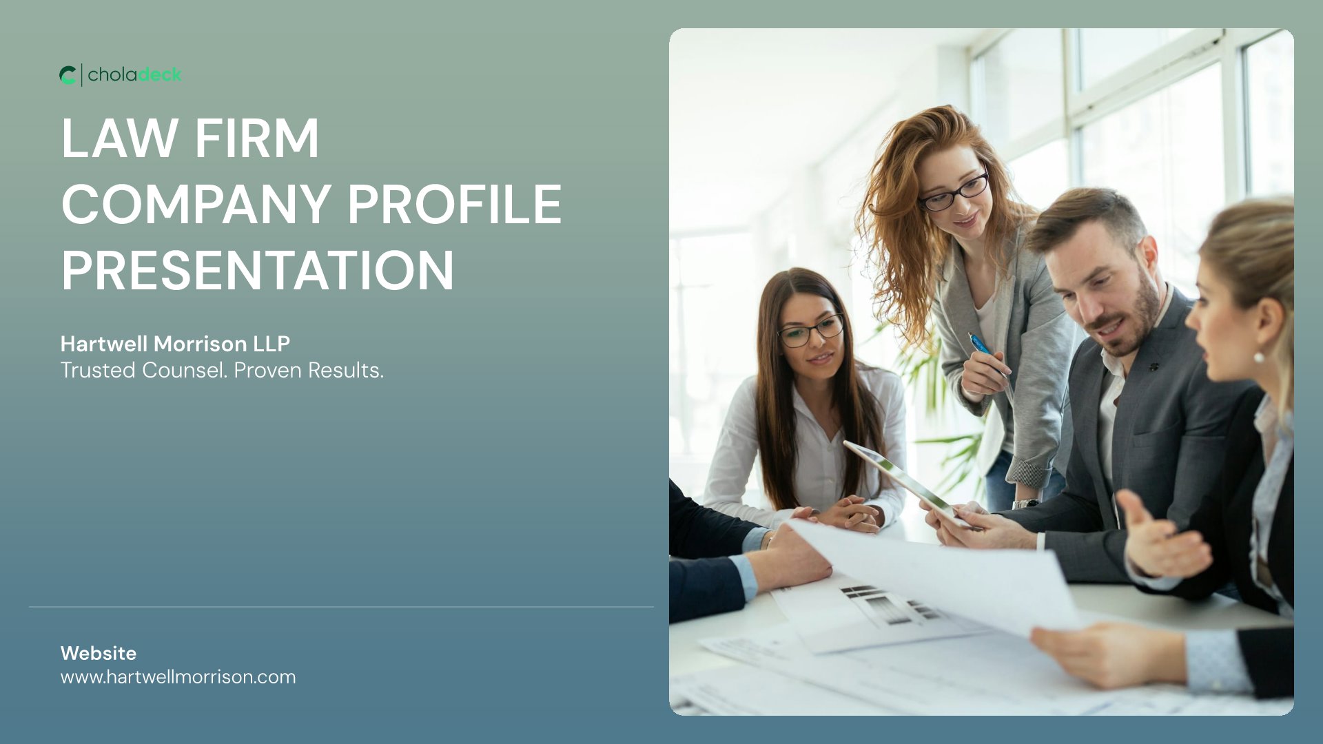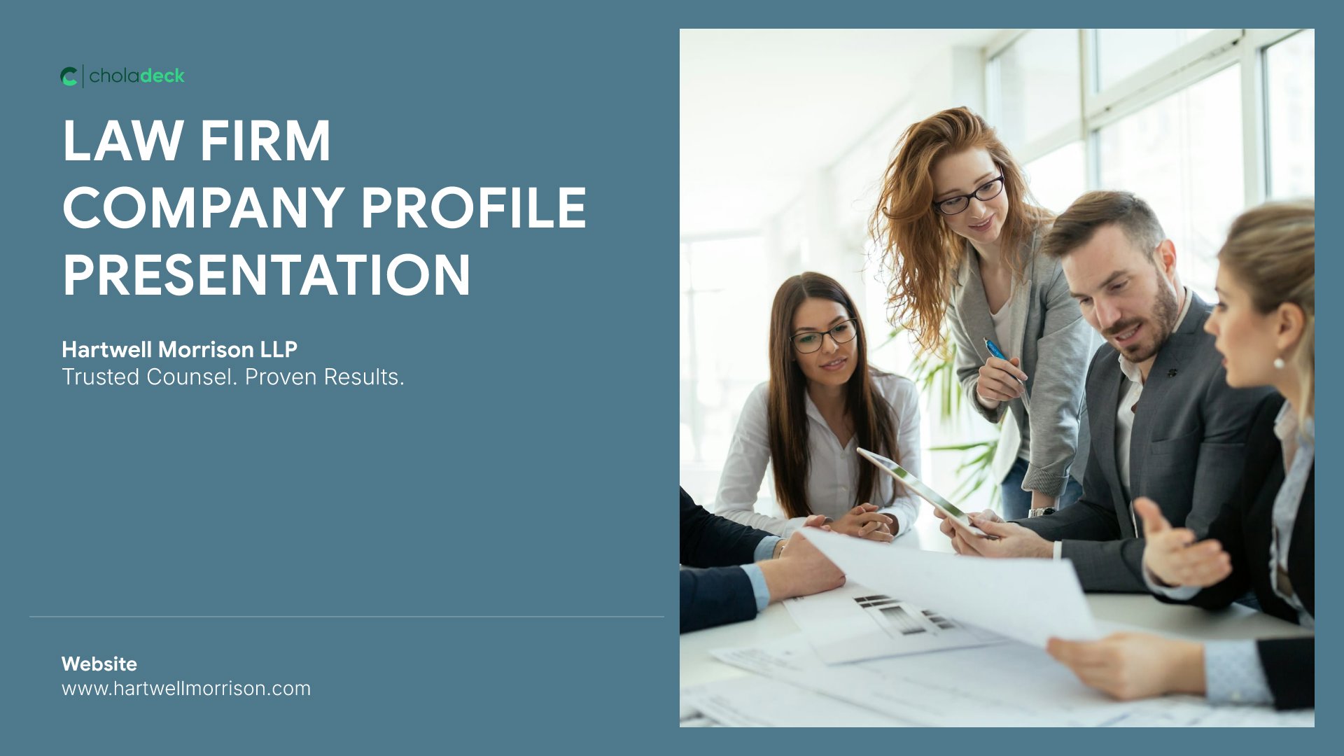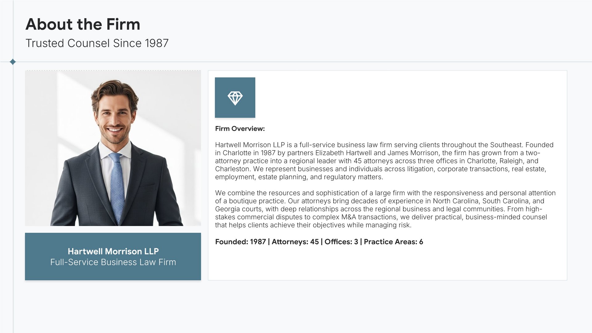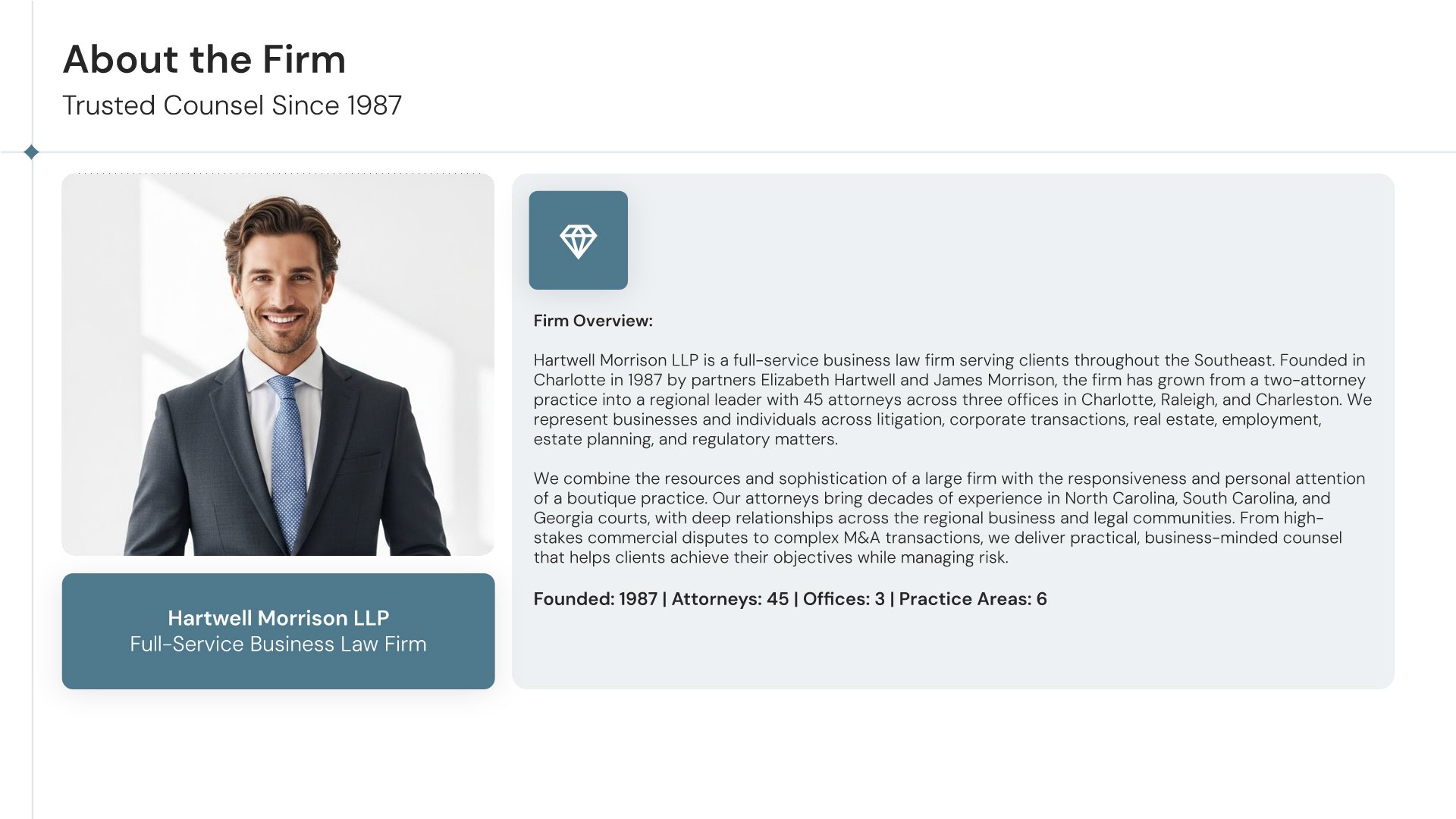 A professionally structured law firm company profile template following the Universal Company Profile framework adapted for legal services. Built for law firms showcasing their practice to prospective clients, referral sources, and partners. Covers firm history, practice areas, methodology, team credentials, client testimonials, and recognition.