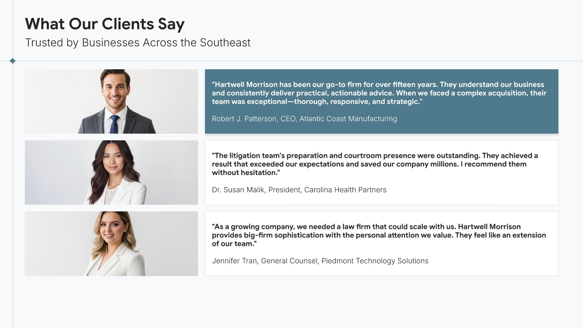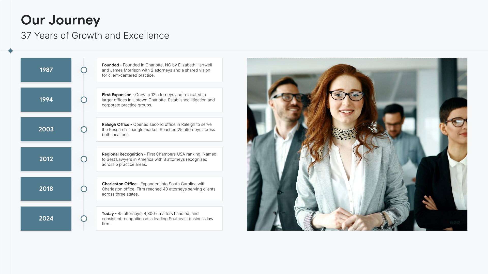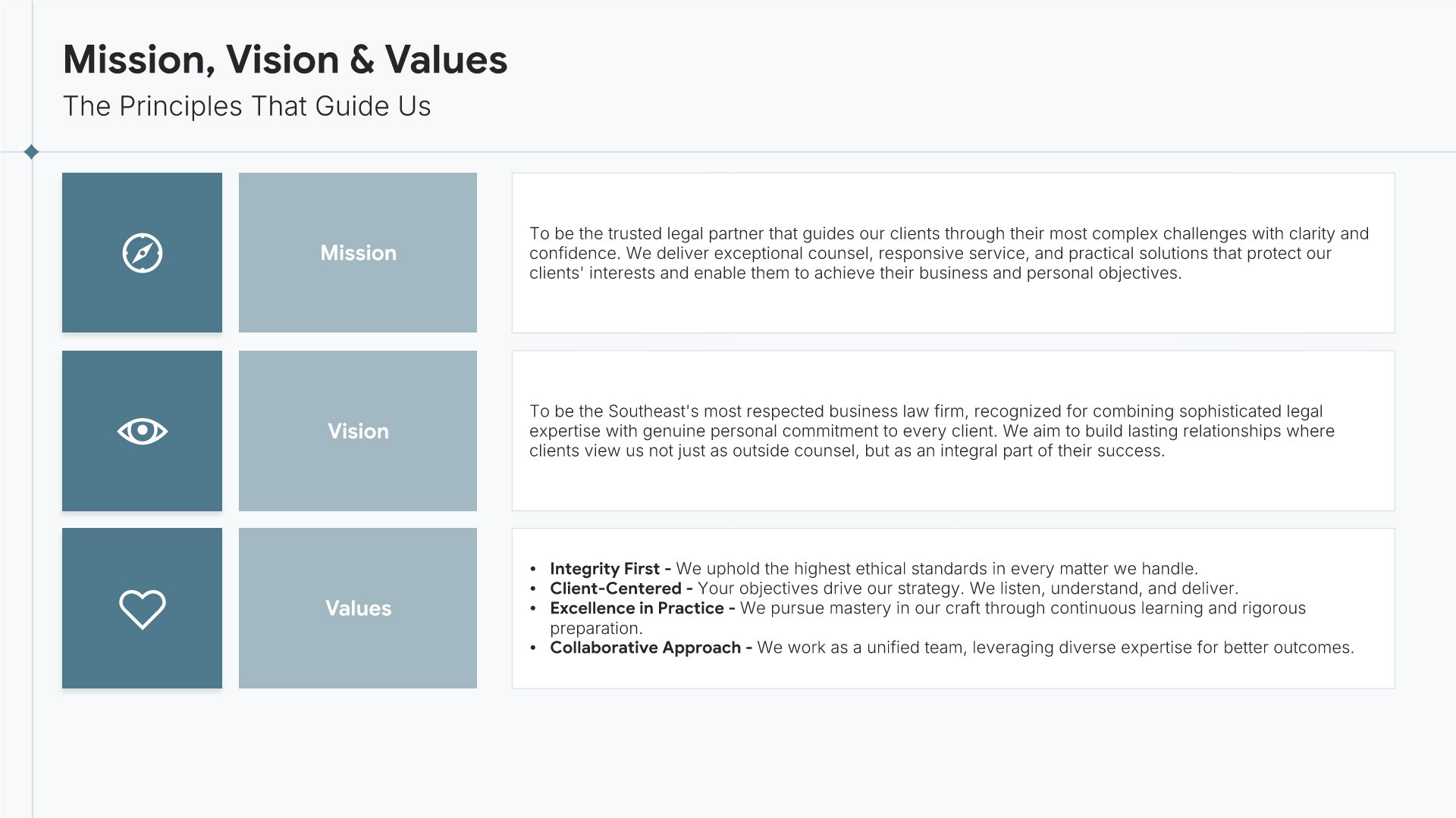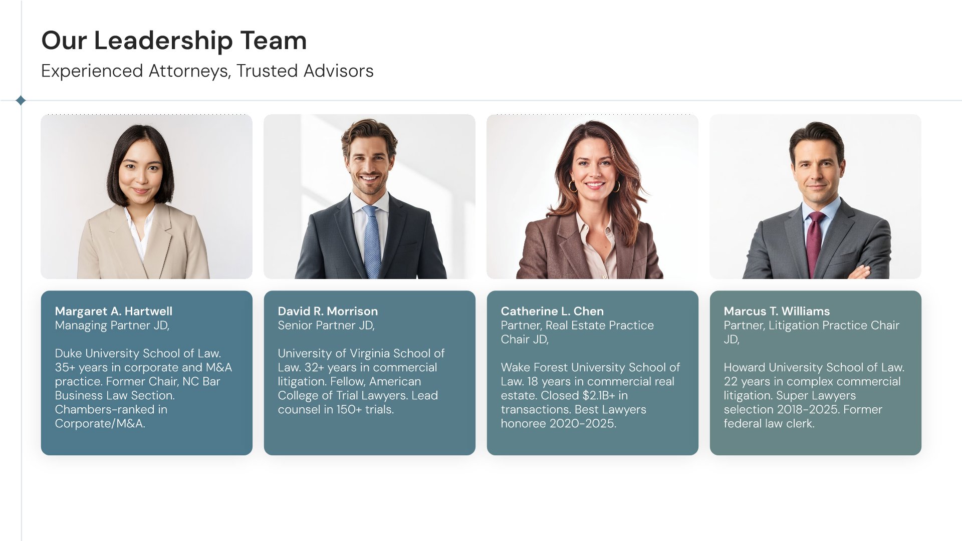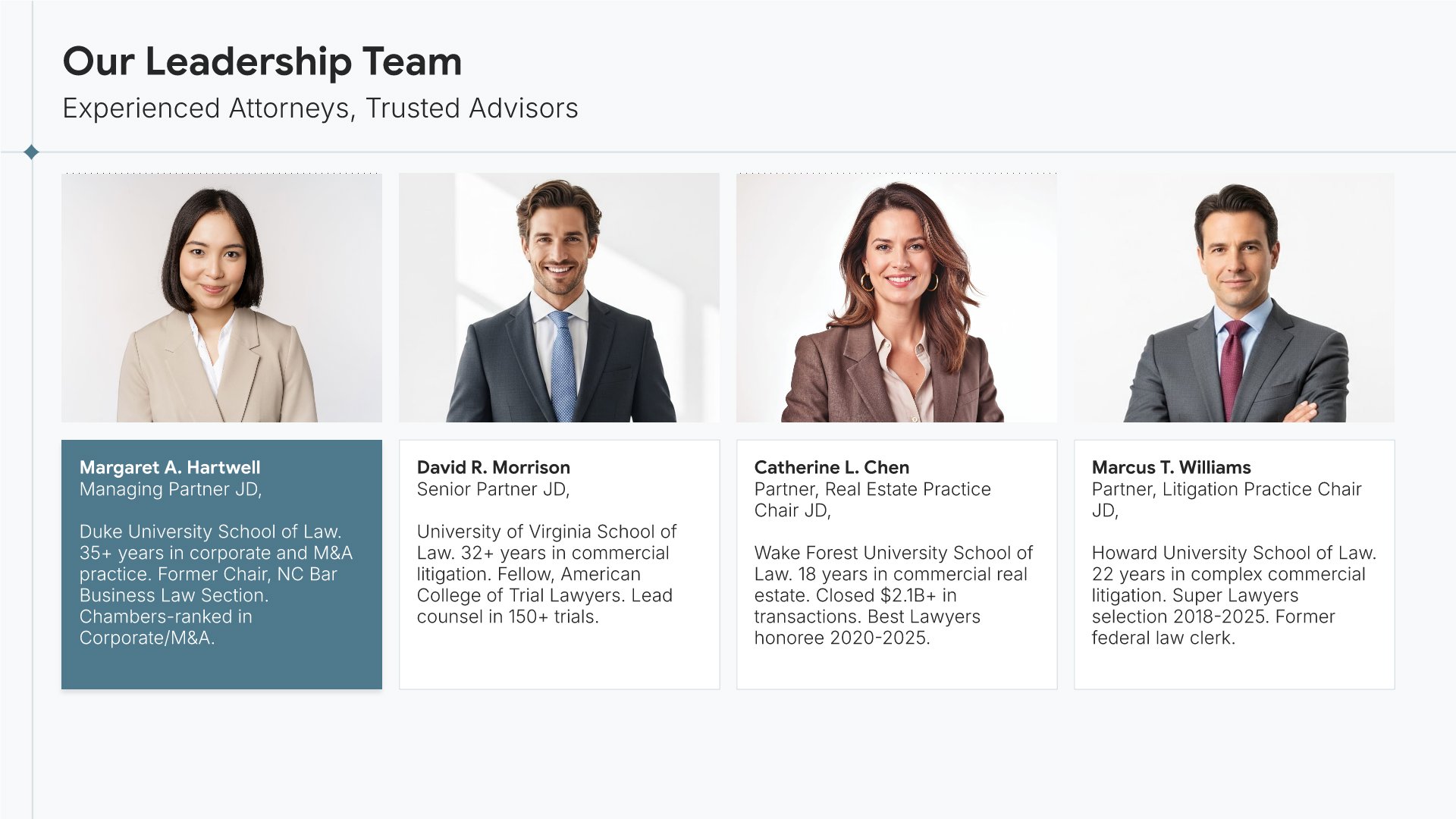 A professionally structured law firm company profile template following the Universal Company Profile framework adapted for legal services. Built for law firms showcasing their practice to prospective clients, referral sources, and partners. Covers firm history, practice areas, methodology, team credentials, client testimonials, and recognition.