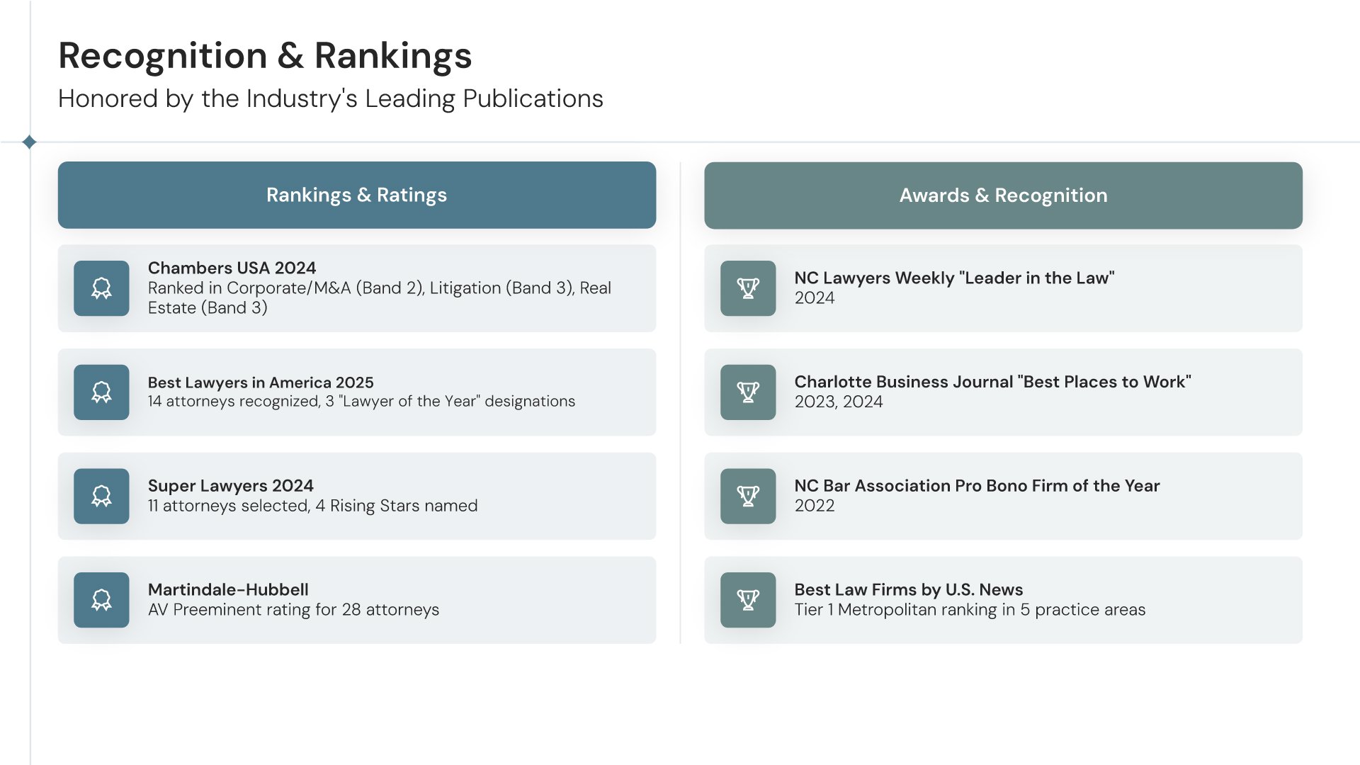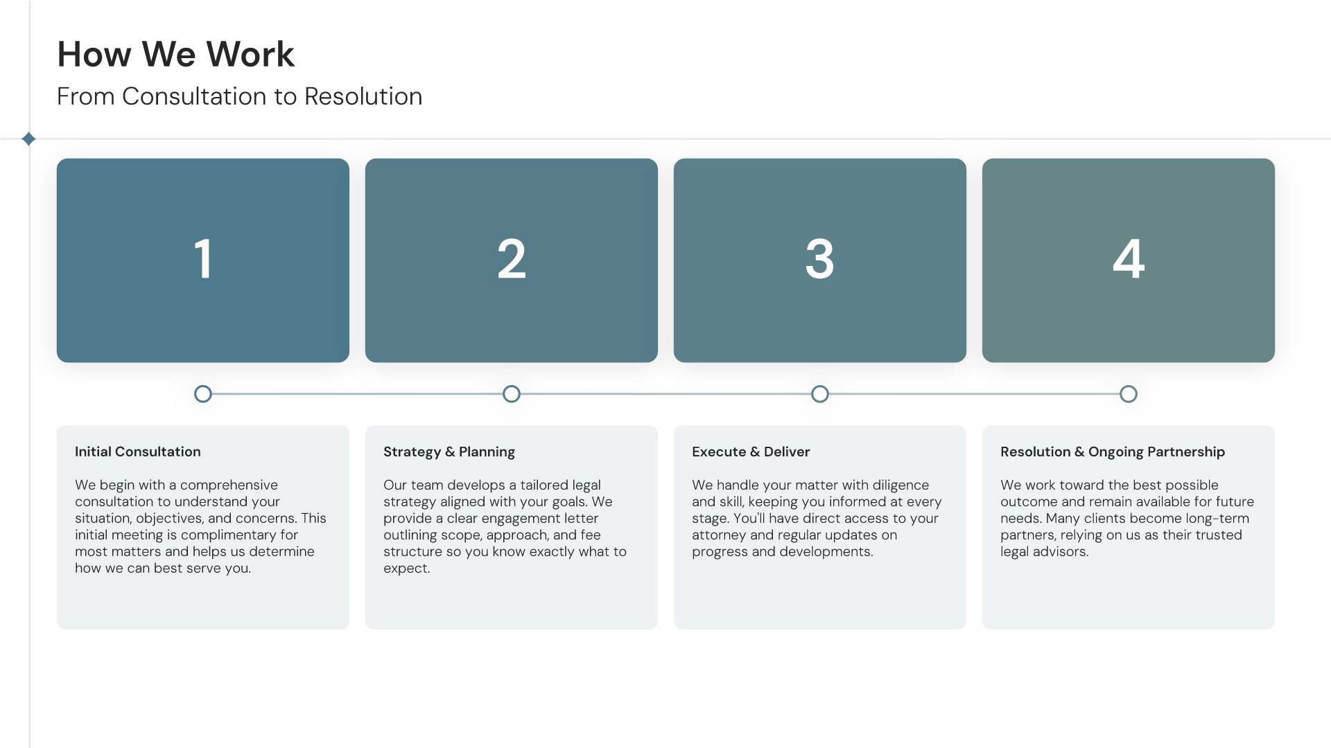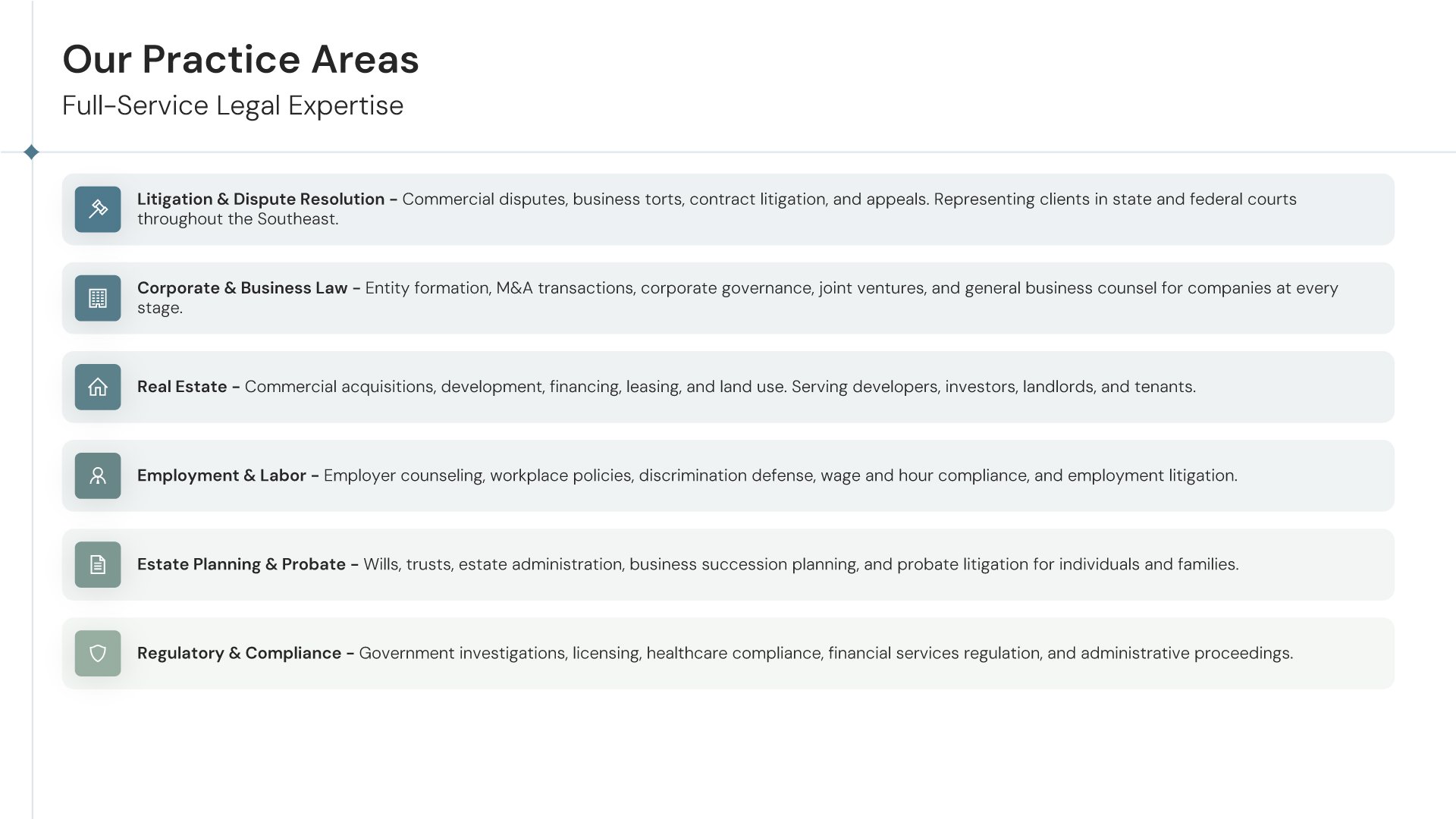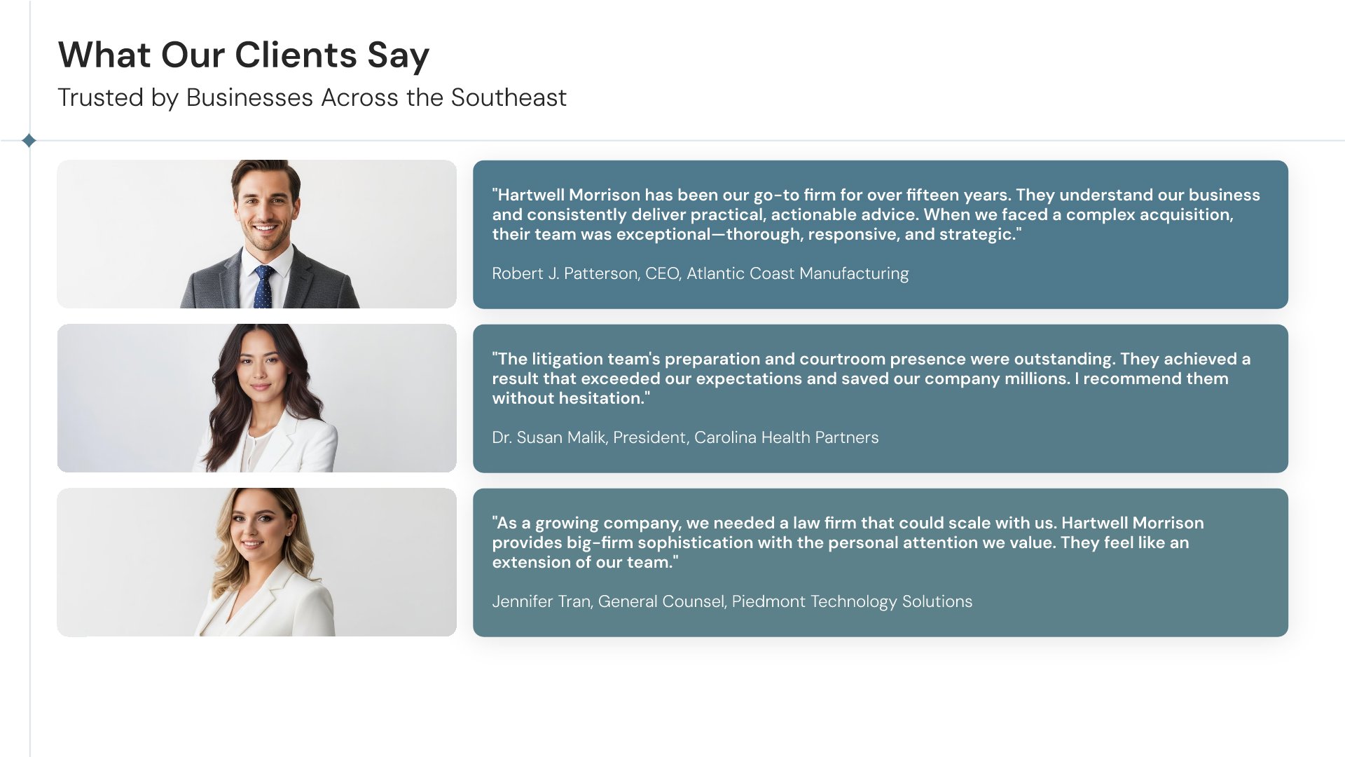A professionally structured law firm company profile template following the Universal Company Profile framework adapted for legal services. Built for law firms showcasing their practice to prospective clients, referral sources, and partners. Covers firm history, practice areas, methodology, team credentials, client testimonials, and recognition.