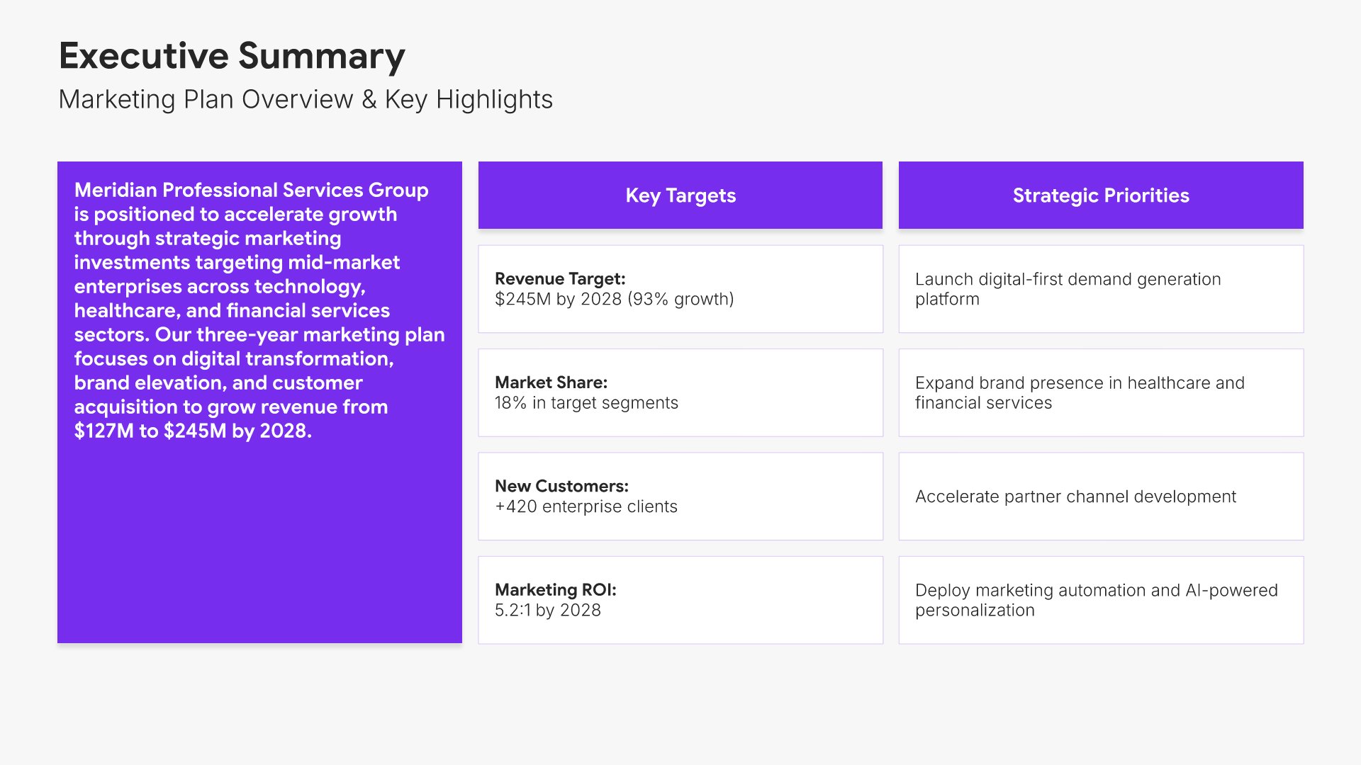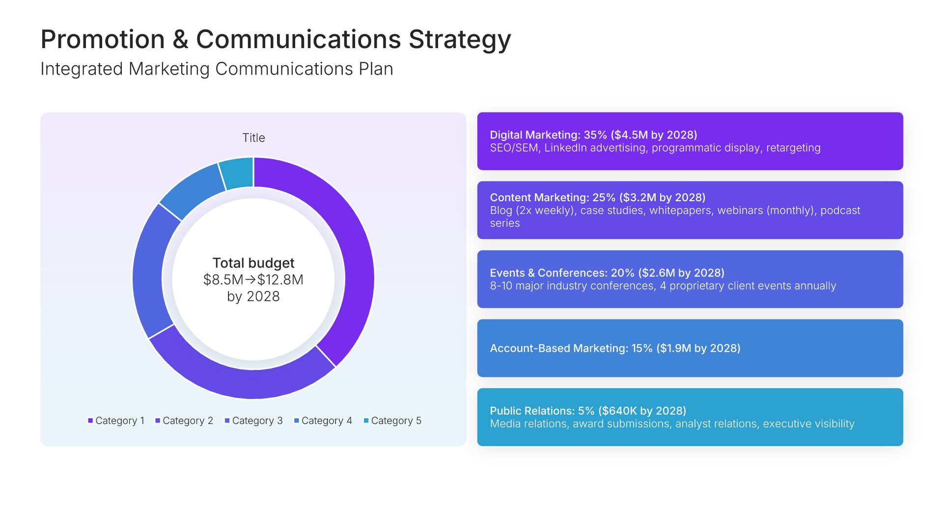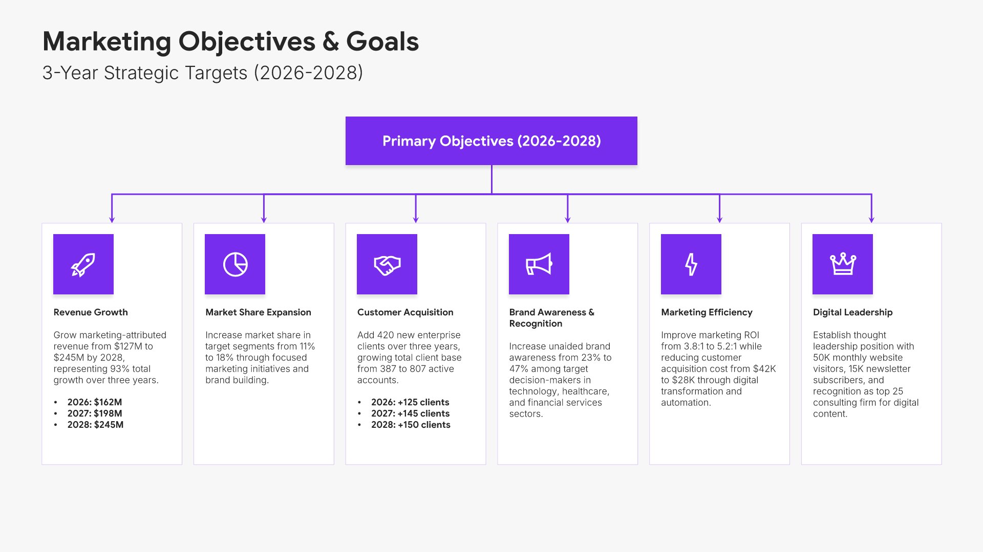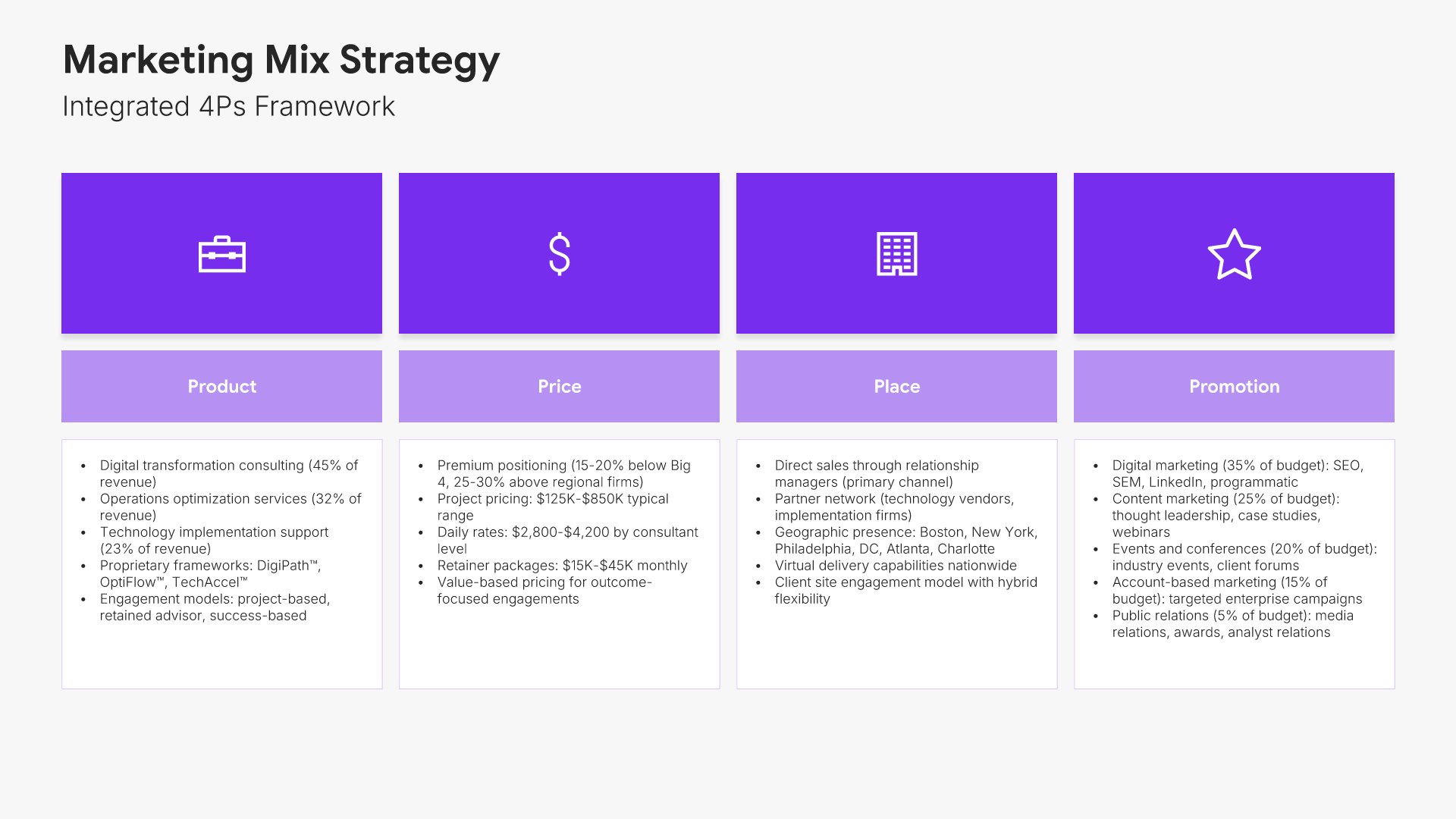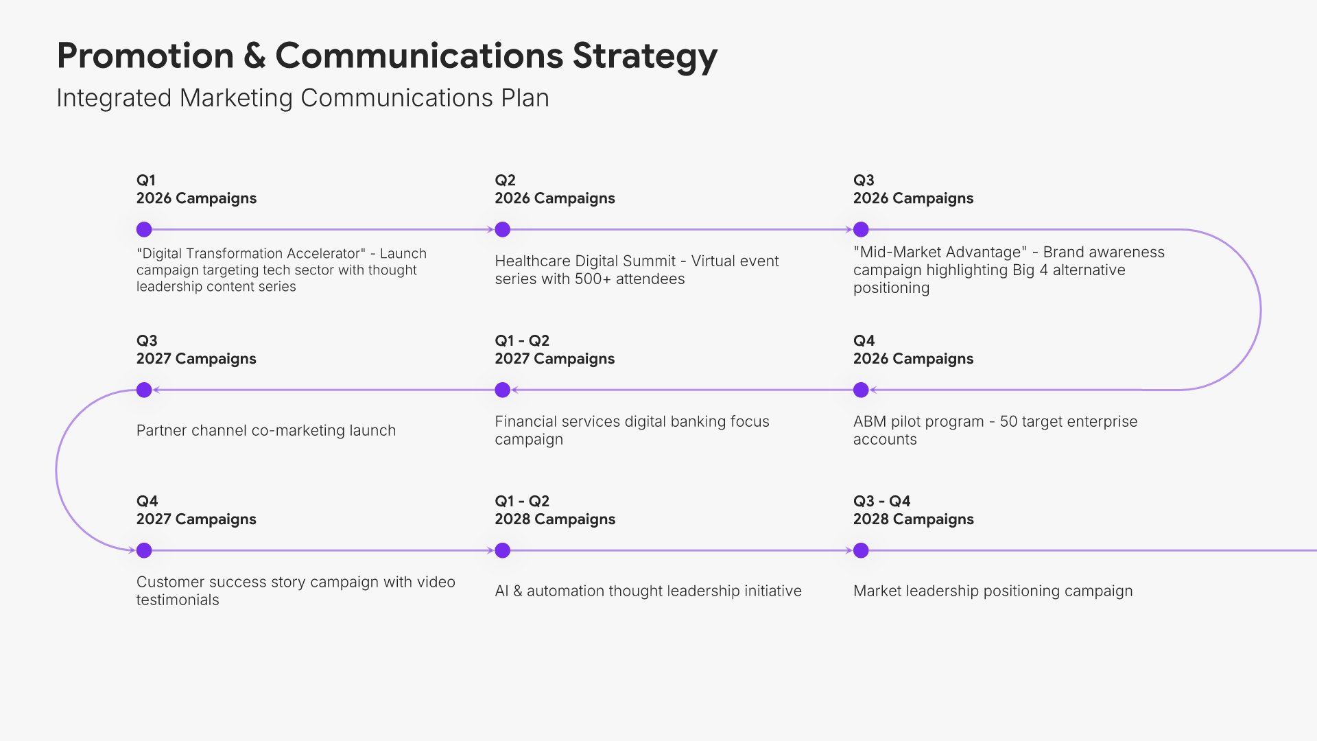 A comprehensive marketing plan template designed for organizations developing strategic marketing initiatives. Built on the Classic Philip Kotler Framework, this presentation covers market analysis, customer segmentation, competitive positioning, marketing mix strategy, budget allocation, and performance measurement. Ideal for annual planning.