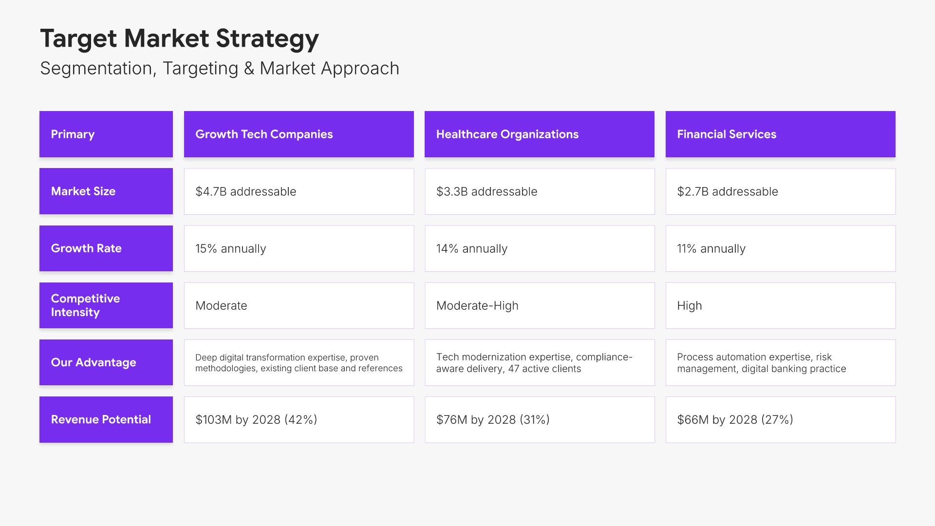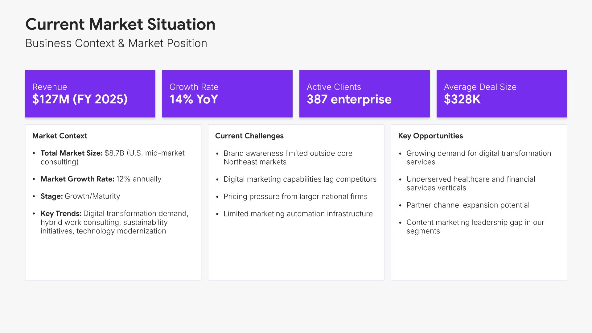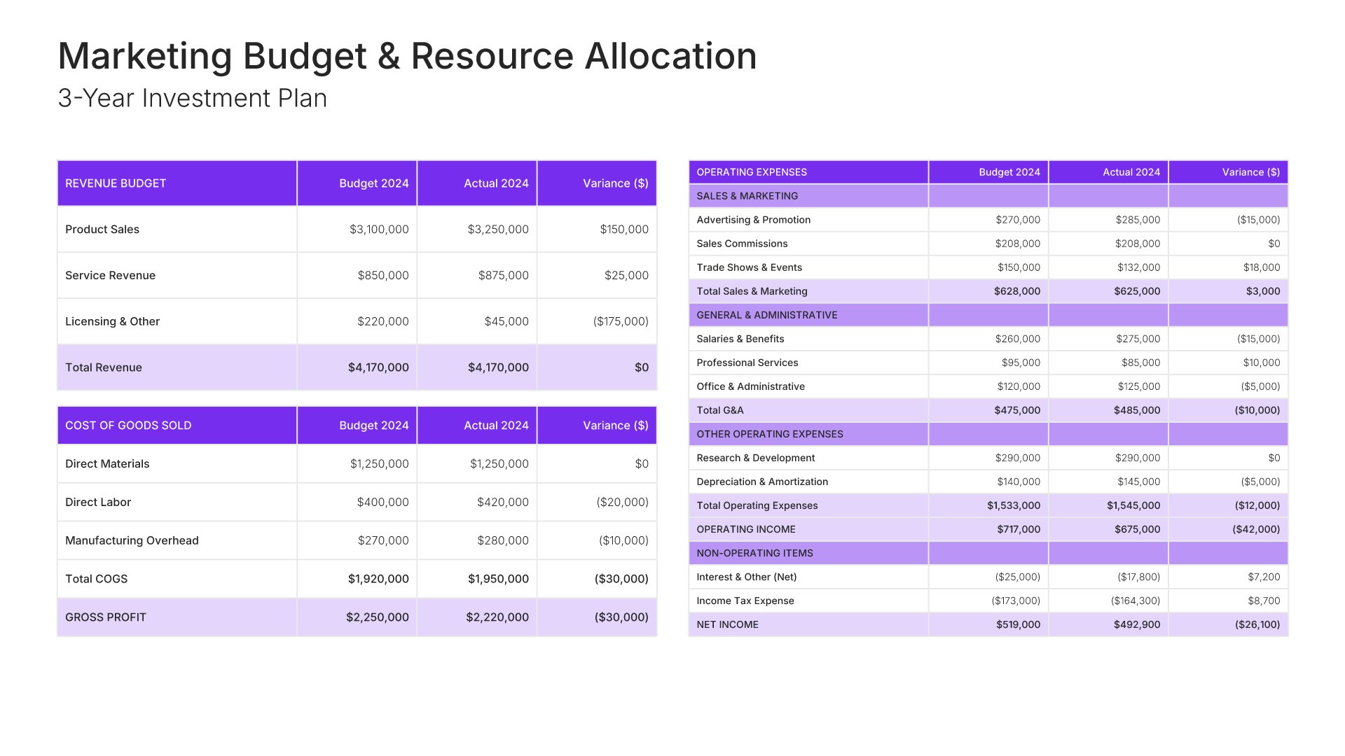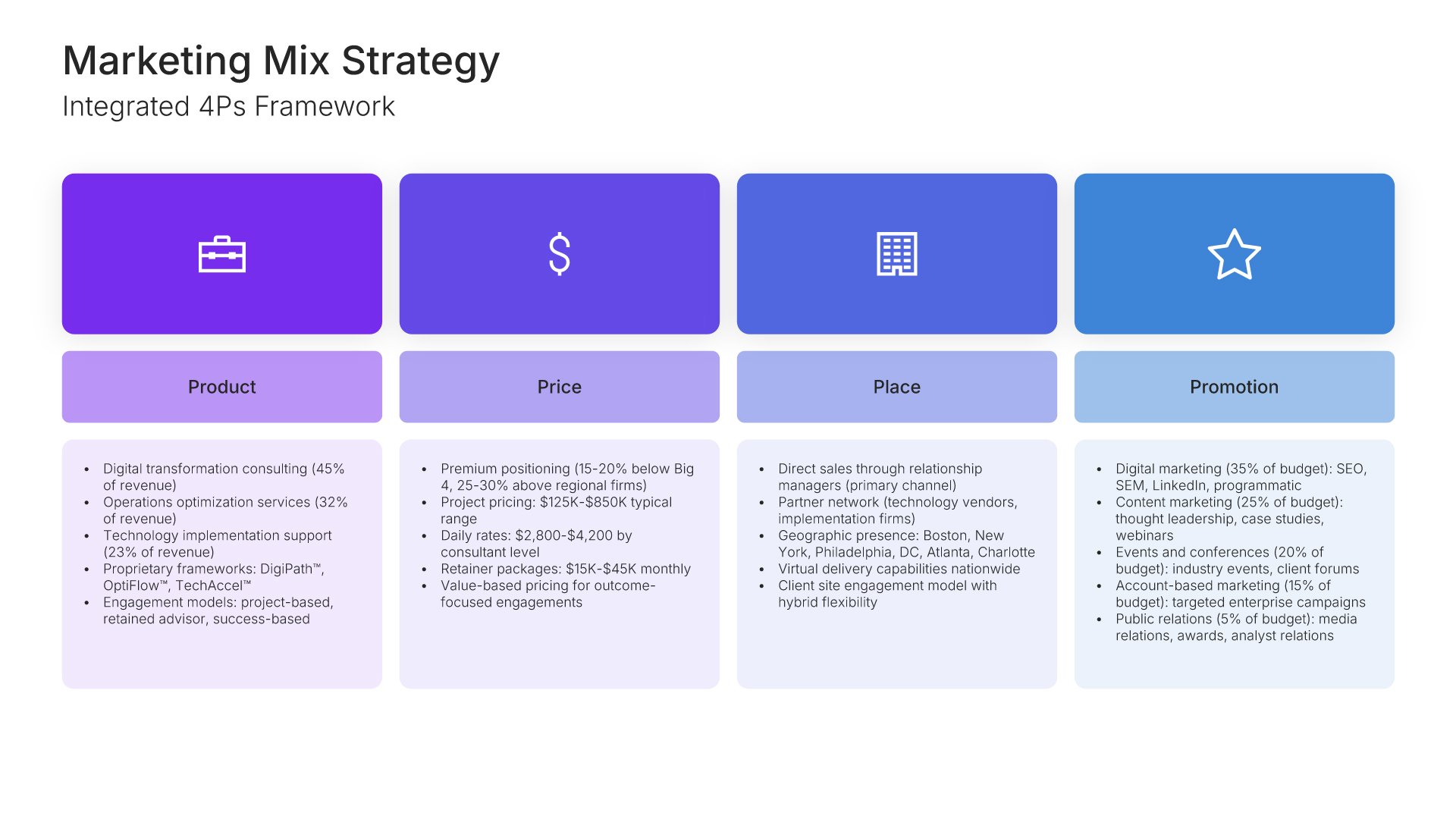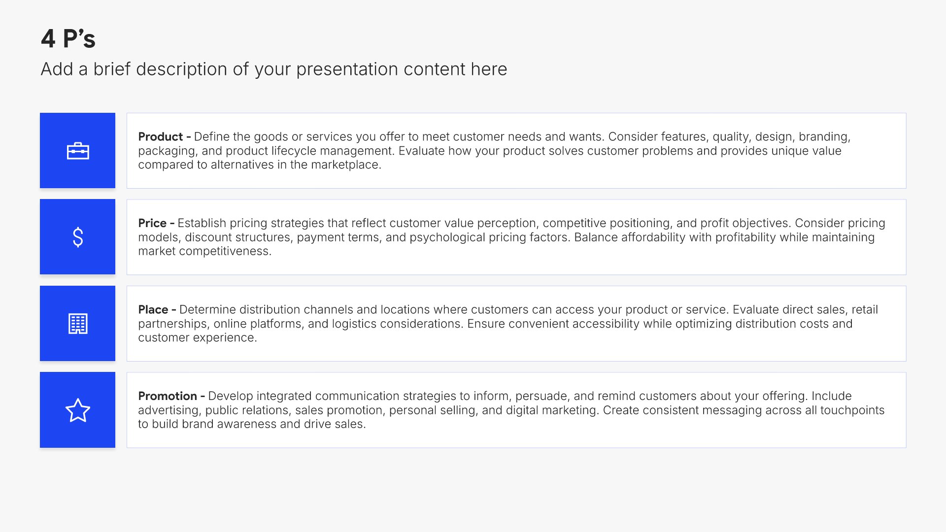 A comprehensive marketing plan template designed for organizations developing strategic marketing initiatives. Built on the Classic Philip Kotler Framework, this presentation covers market analysis, customer segmentation, competitive positioning, marketing mix strategy, budget allocation, and performance measurement. Ideal for annual planning.