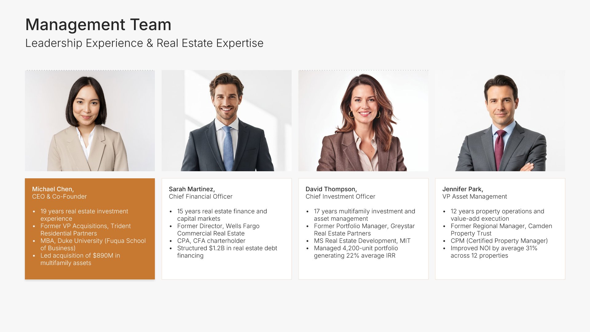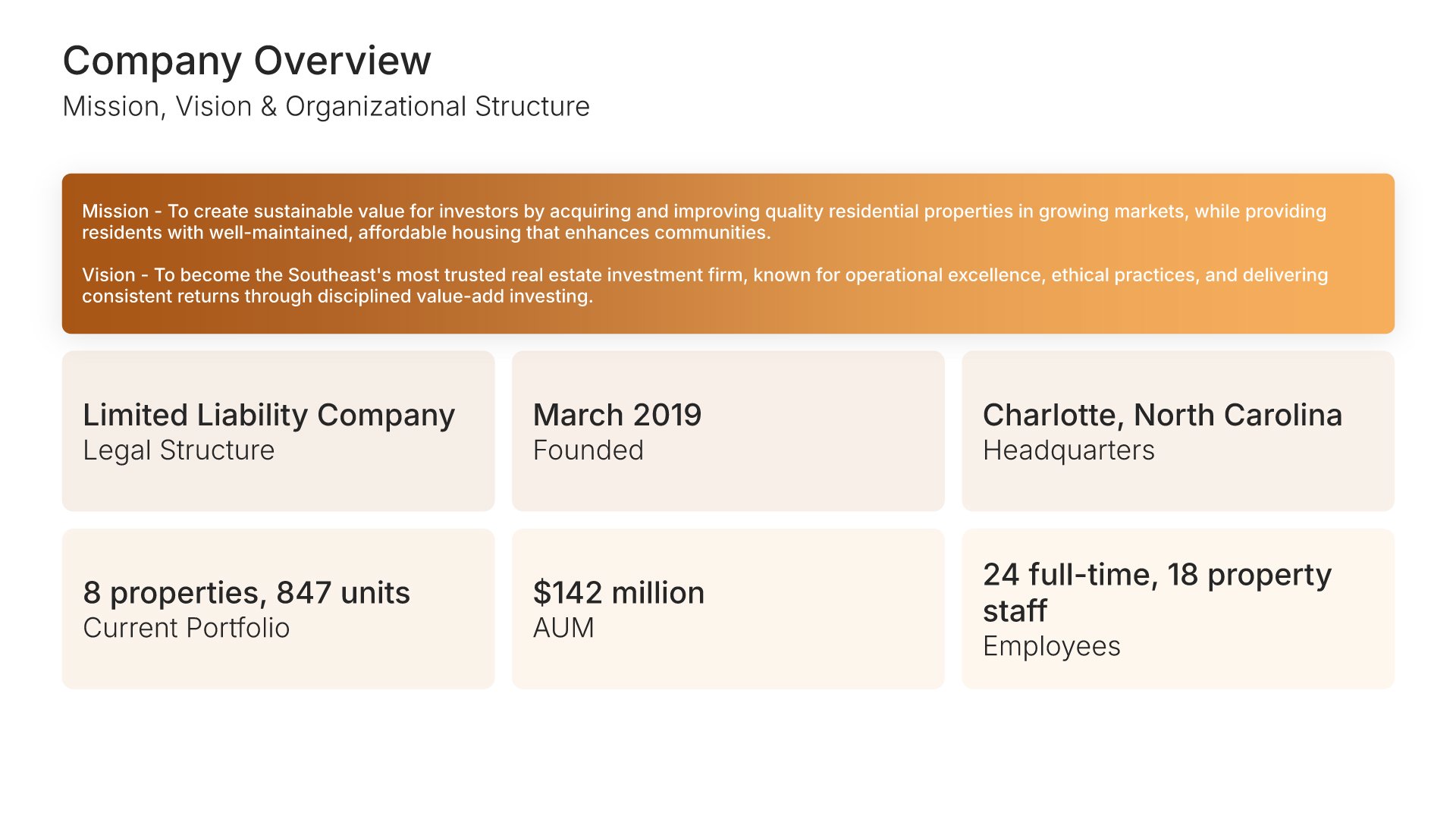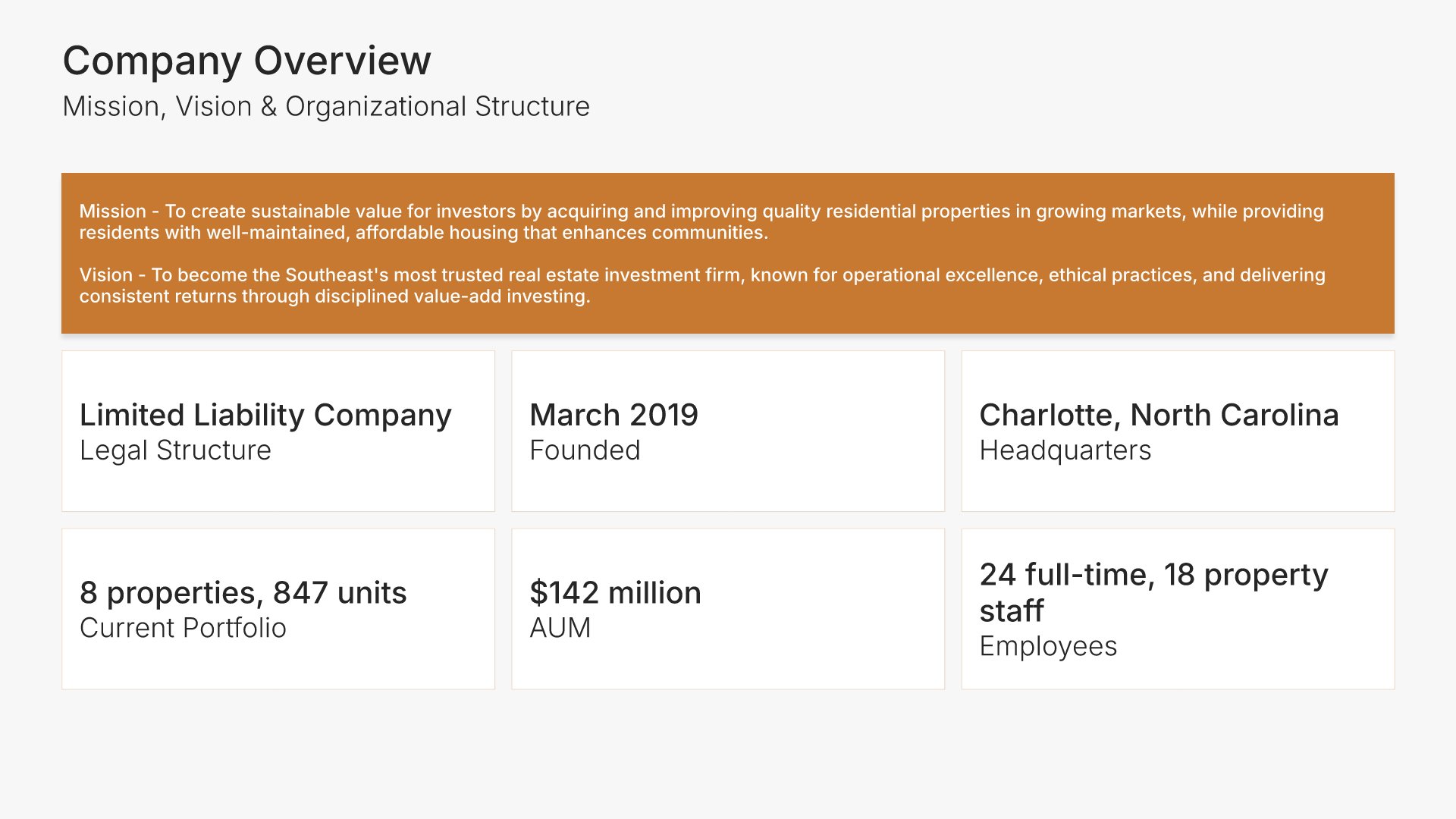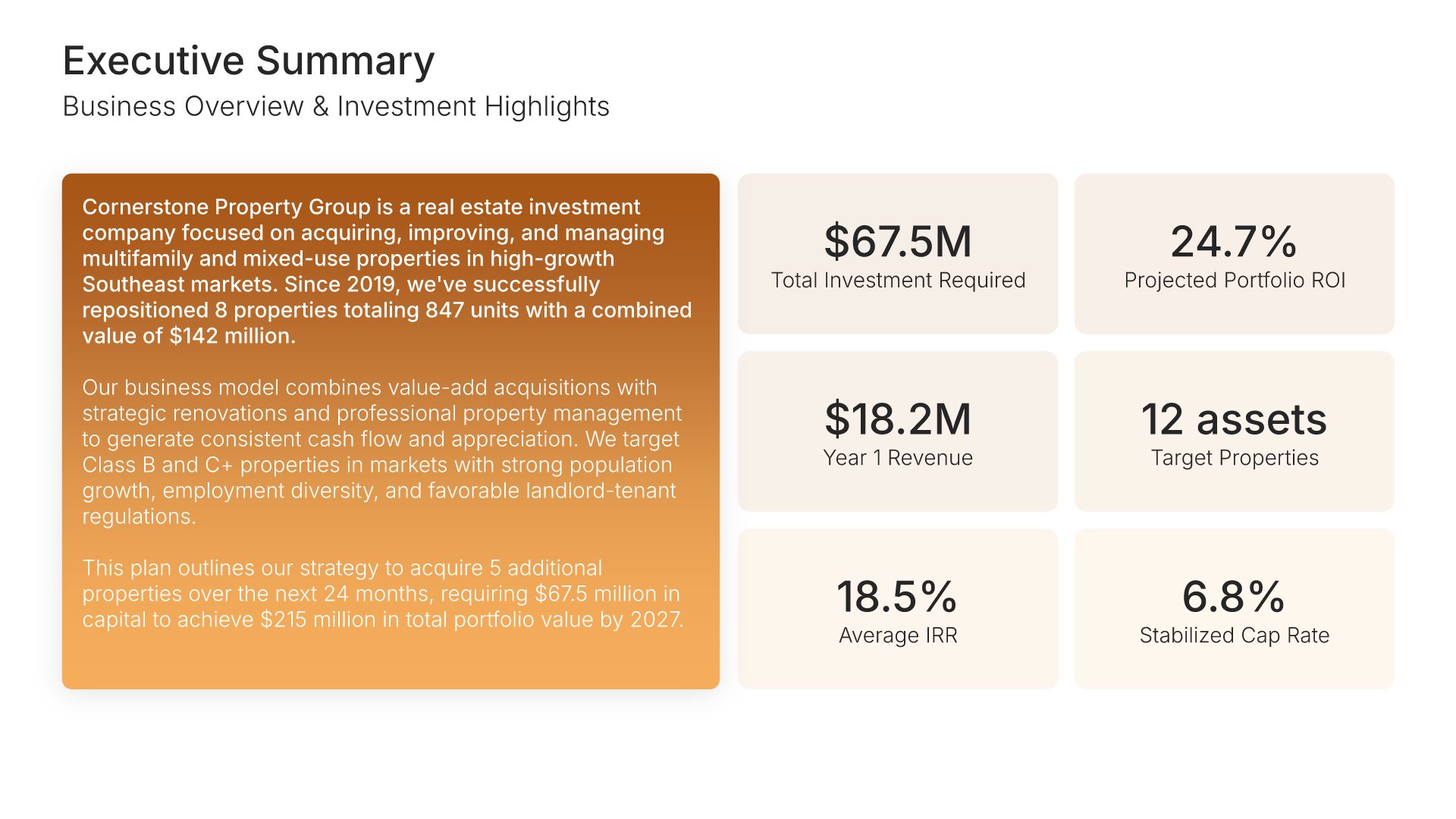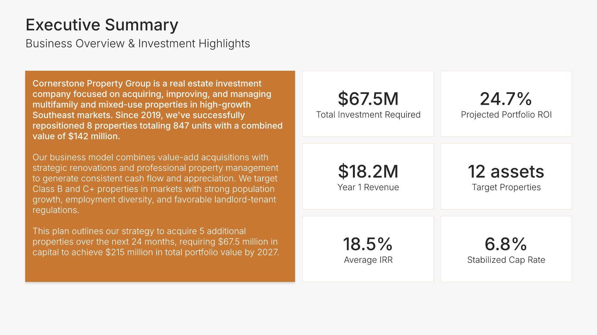 A comprehensive real estate business plan template designed for investment and development firms seeking financing or capital partners. Built on the Classic SBA Lender Model, this presentation covers property portfolio, acquisition strategy, market analysis, revenue model, financial projections, and funding structure. Ideal for multifamily, commercial, and mixed-use real estate firms.