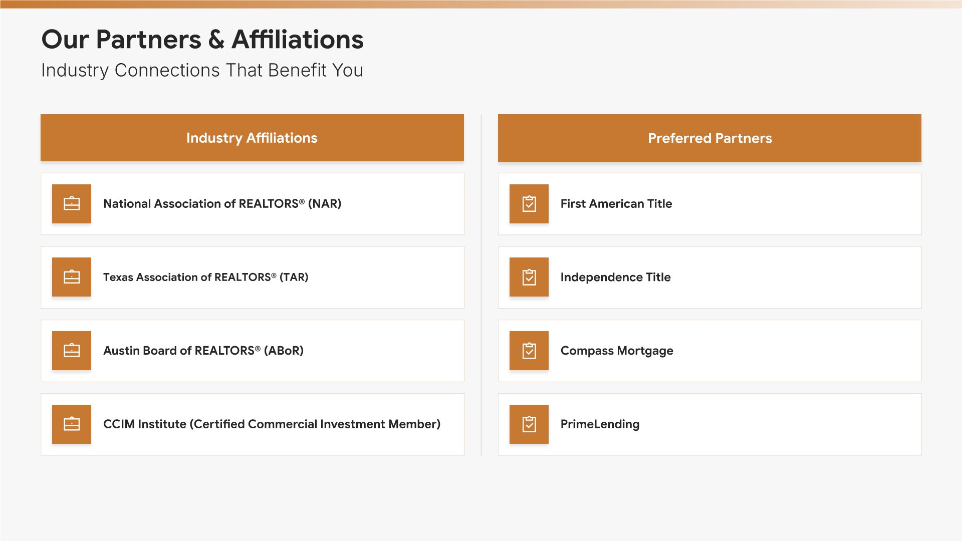 Partners and affiliations slides help you showcase your industry relationships and memberships. Use them to present strategic partners, association memberships, professional networks, and referral relationships. Demonstrating trusted relationships and industry involvement reinforces your credibility and market position.