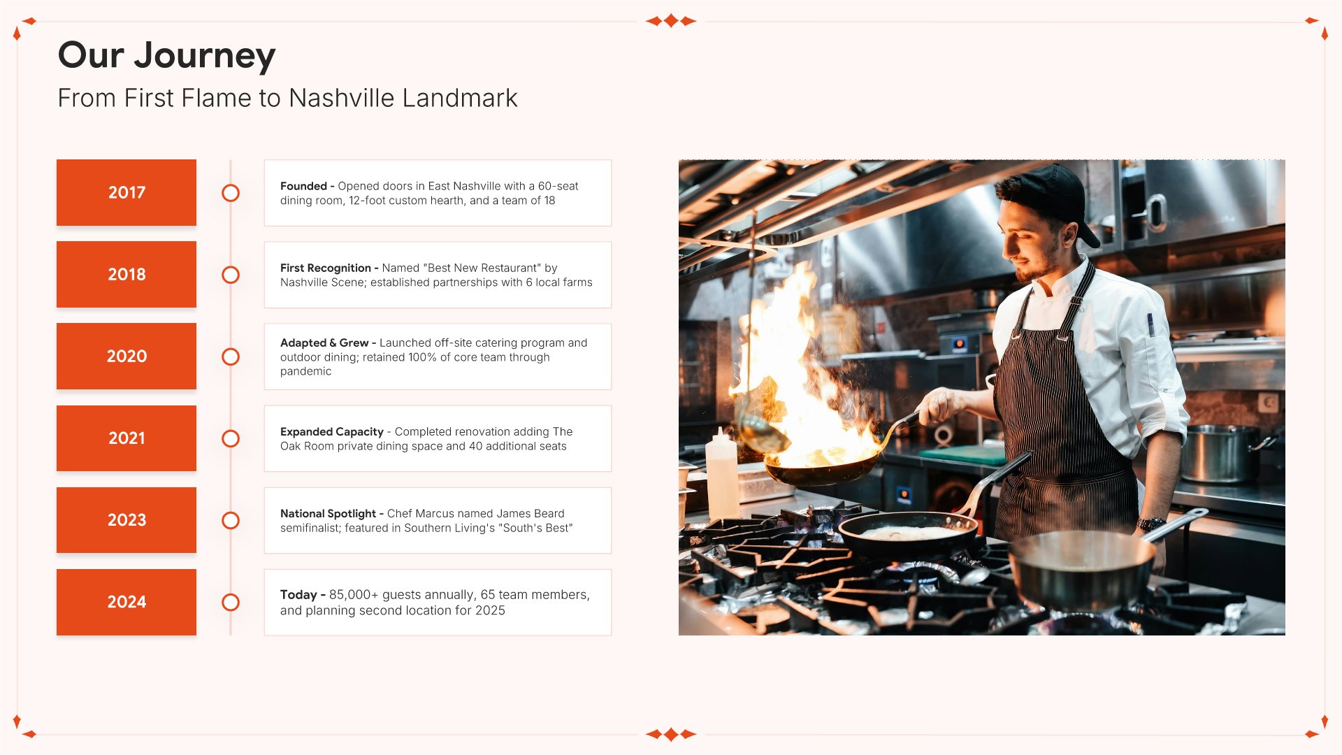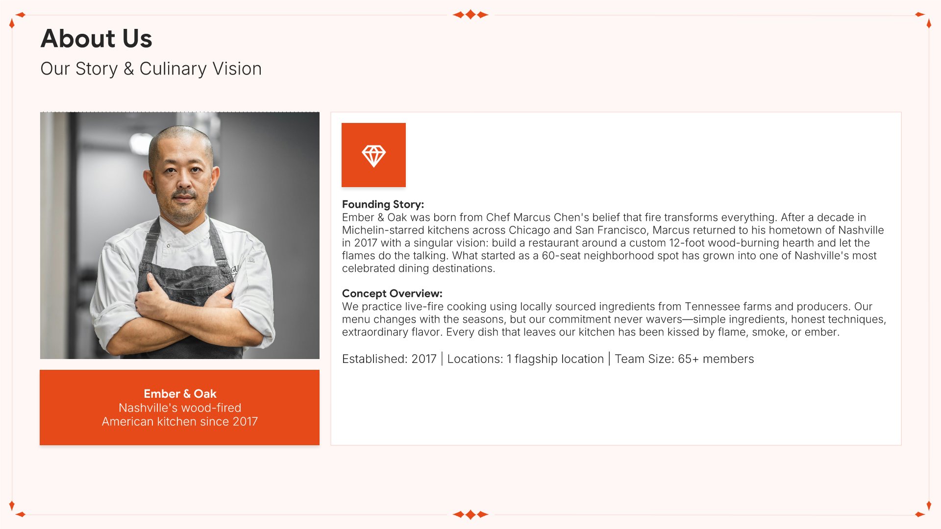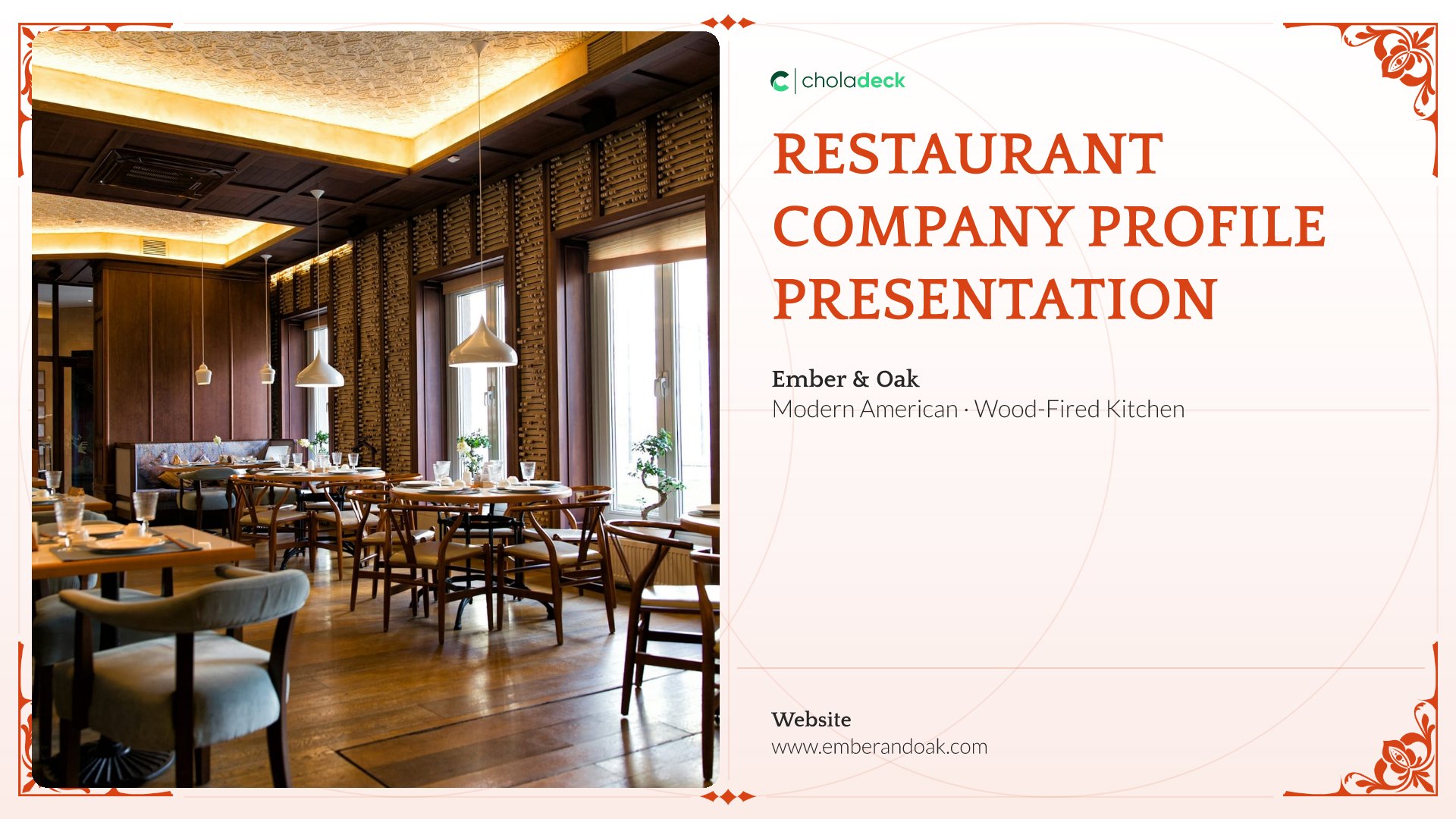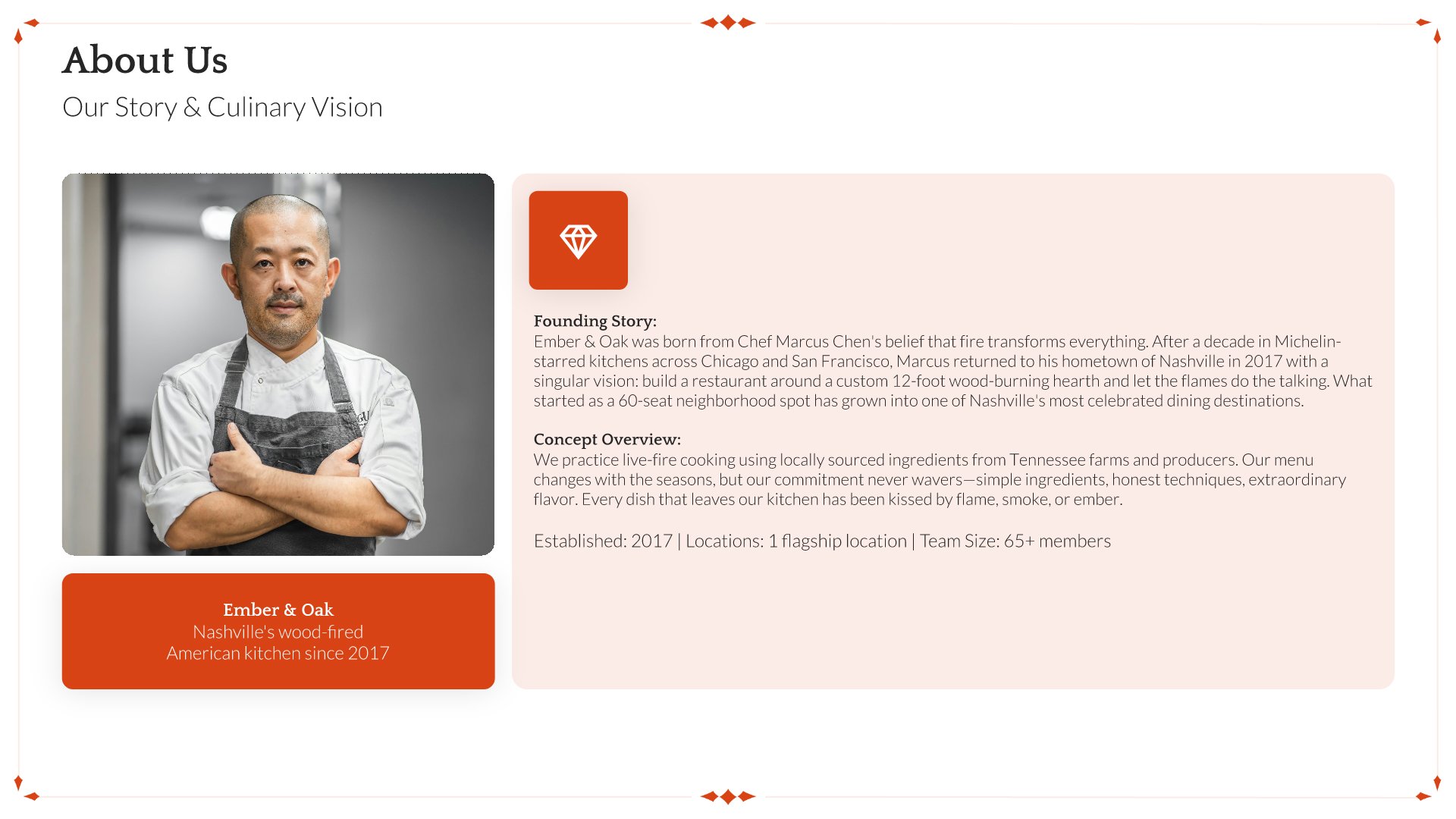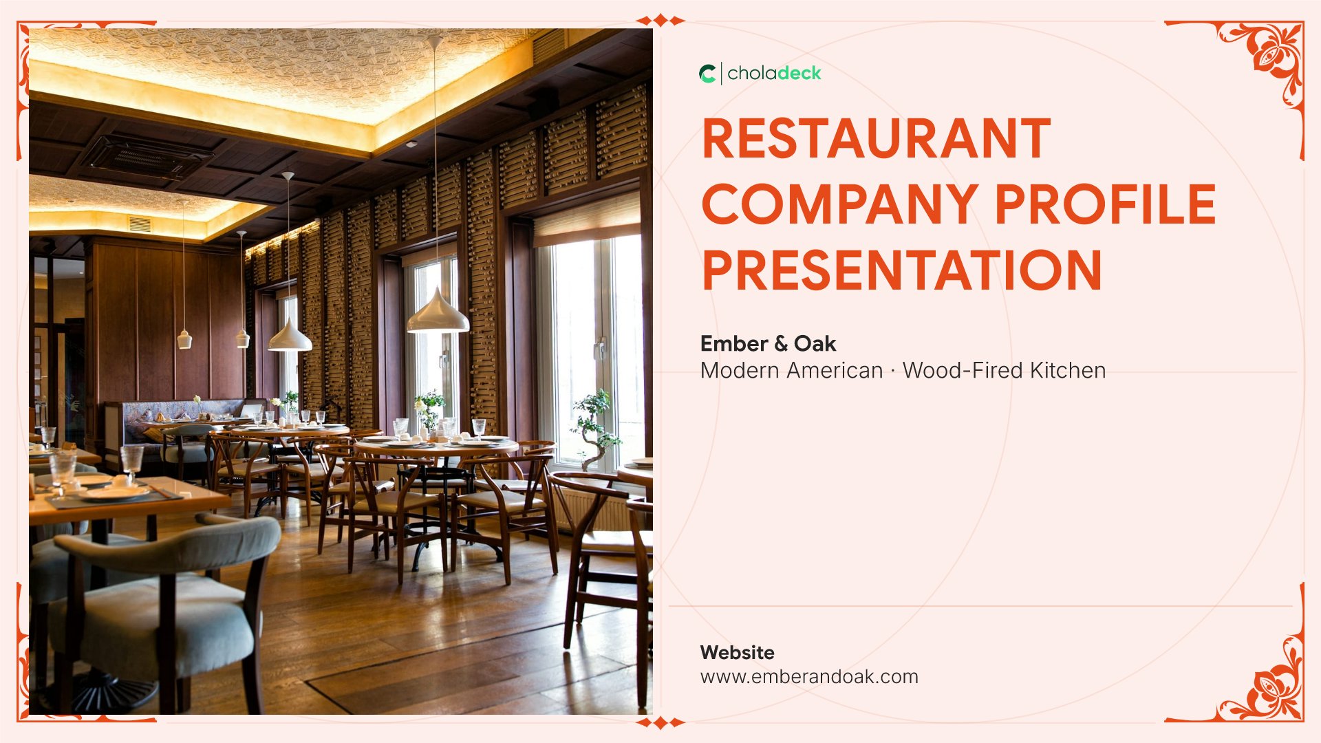 A professionally structured restaurant company profile template following the Universal Company Profile framework, the industry-standard structure for business introductions. Built for restaurants showcasing their concept to investors, partners, and clients. Covers story, journey, cuisine, dining experience, team, guest reviews, and recognition.