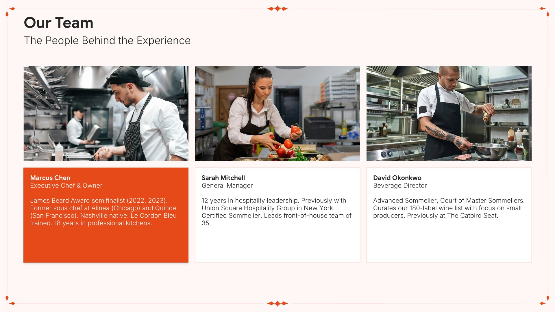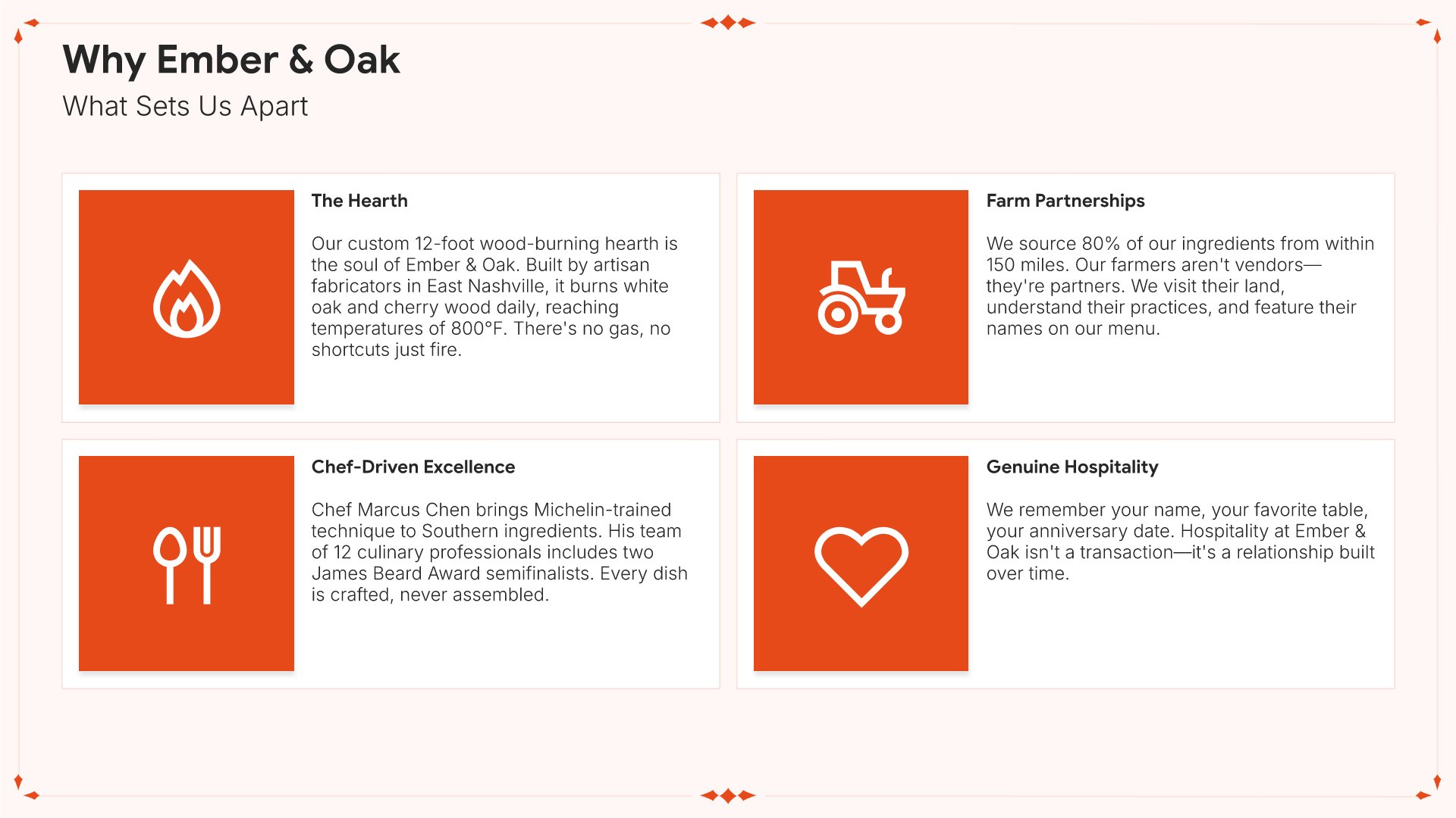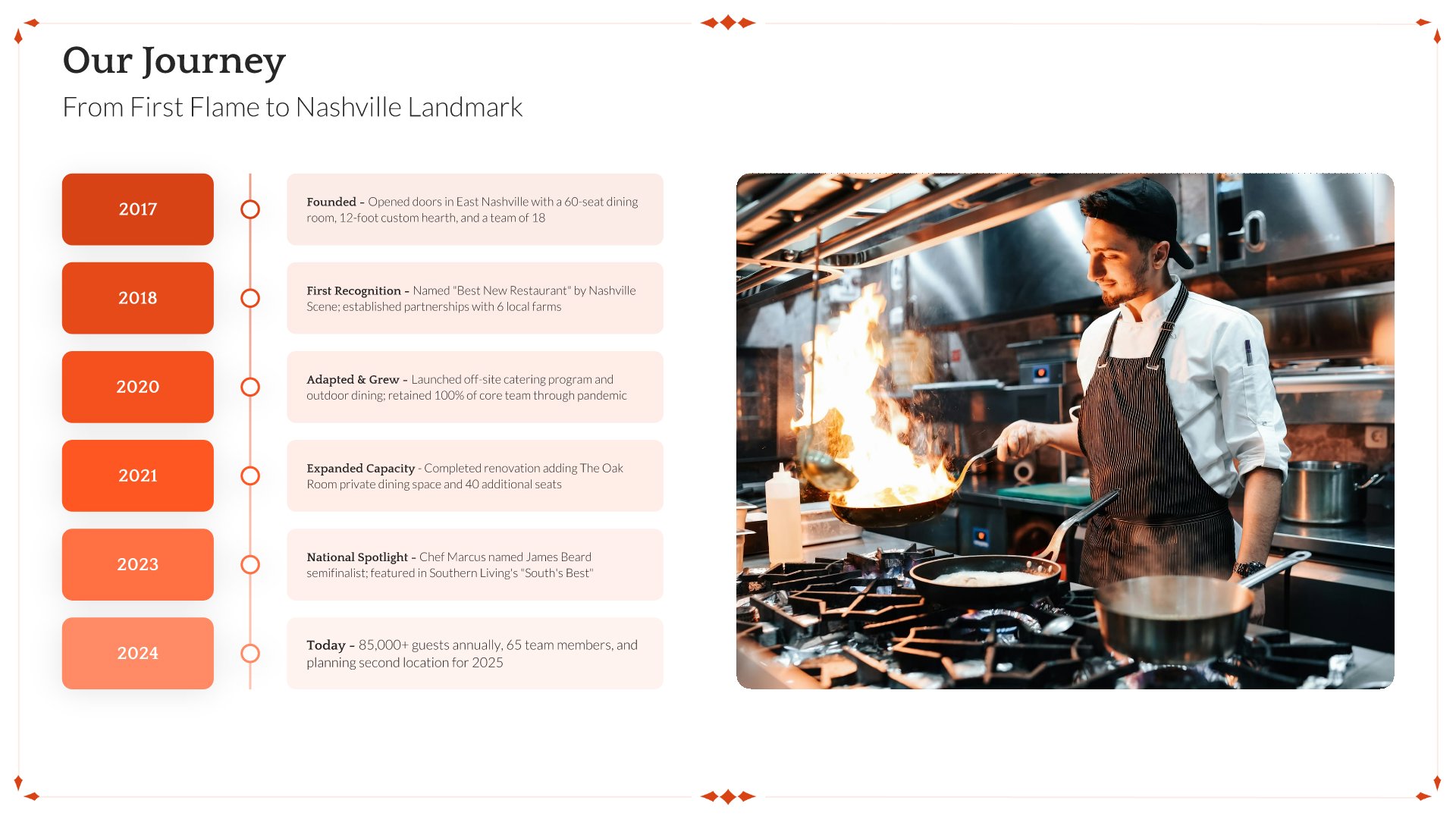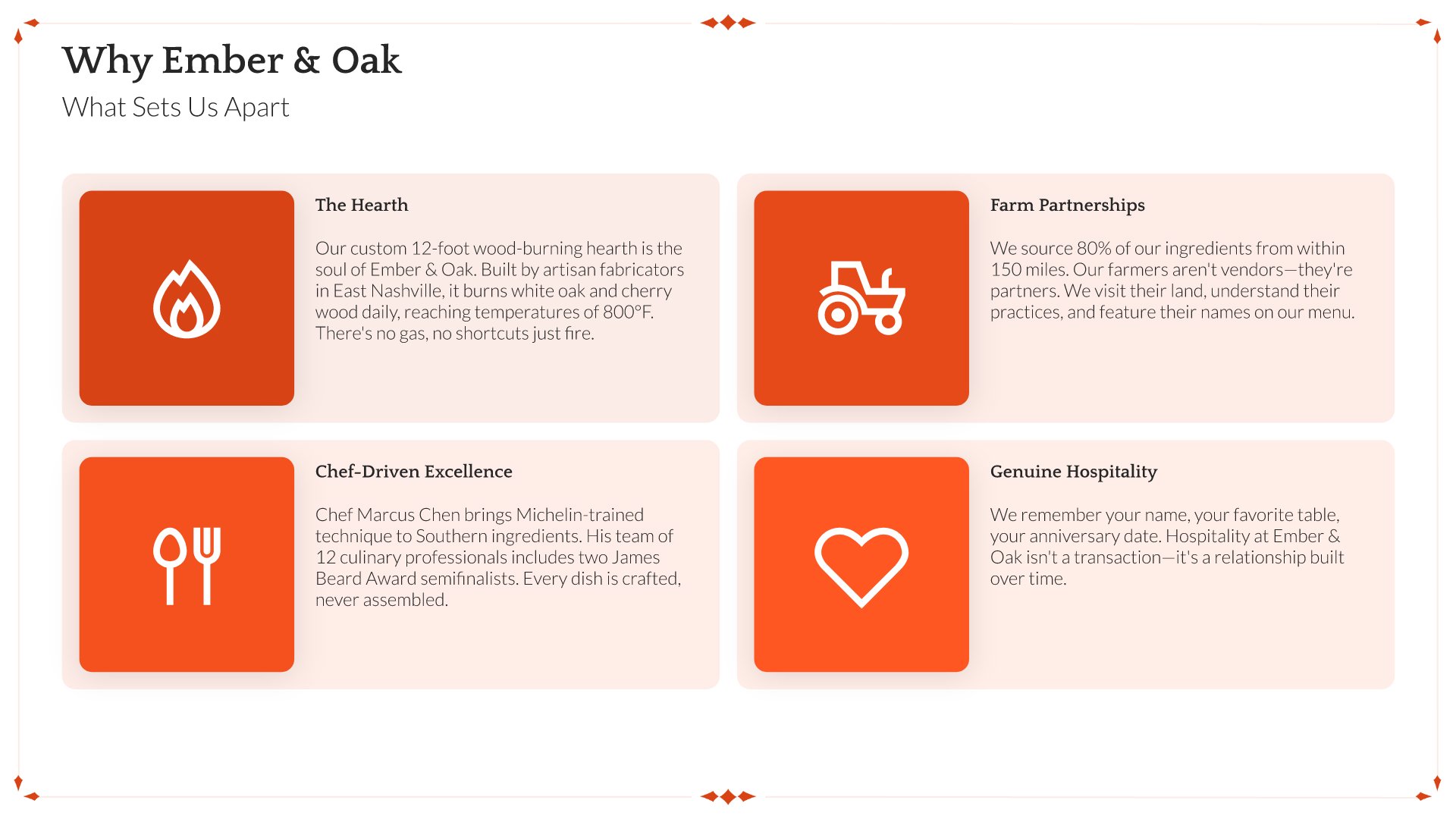 A professionally structured restaurant company profile template following the Universal Company Profile framework, the industry-standard structure for business introductions. Built for restaurants showcasing their concept to investors, partners, and clients. Covers story, journey, cuisine, dining experience, team, guest reviews, and recognition.