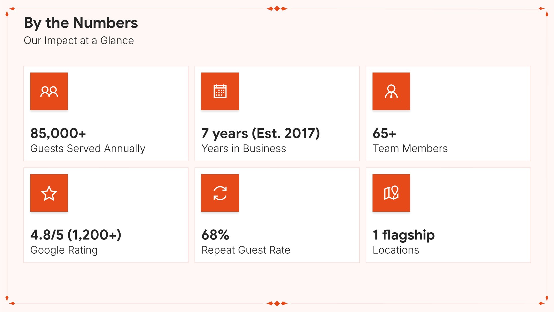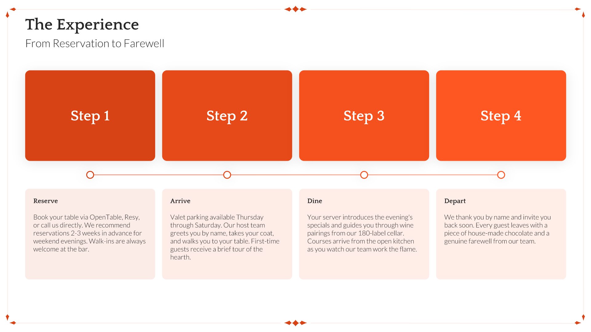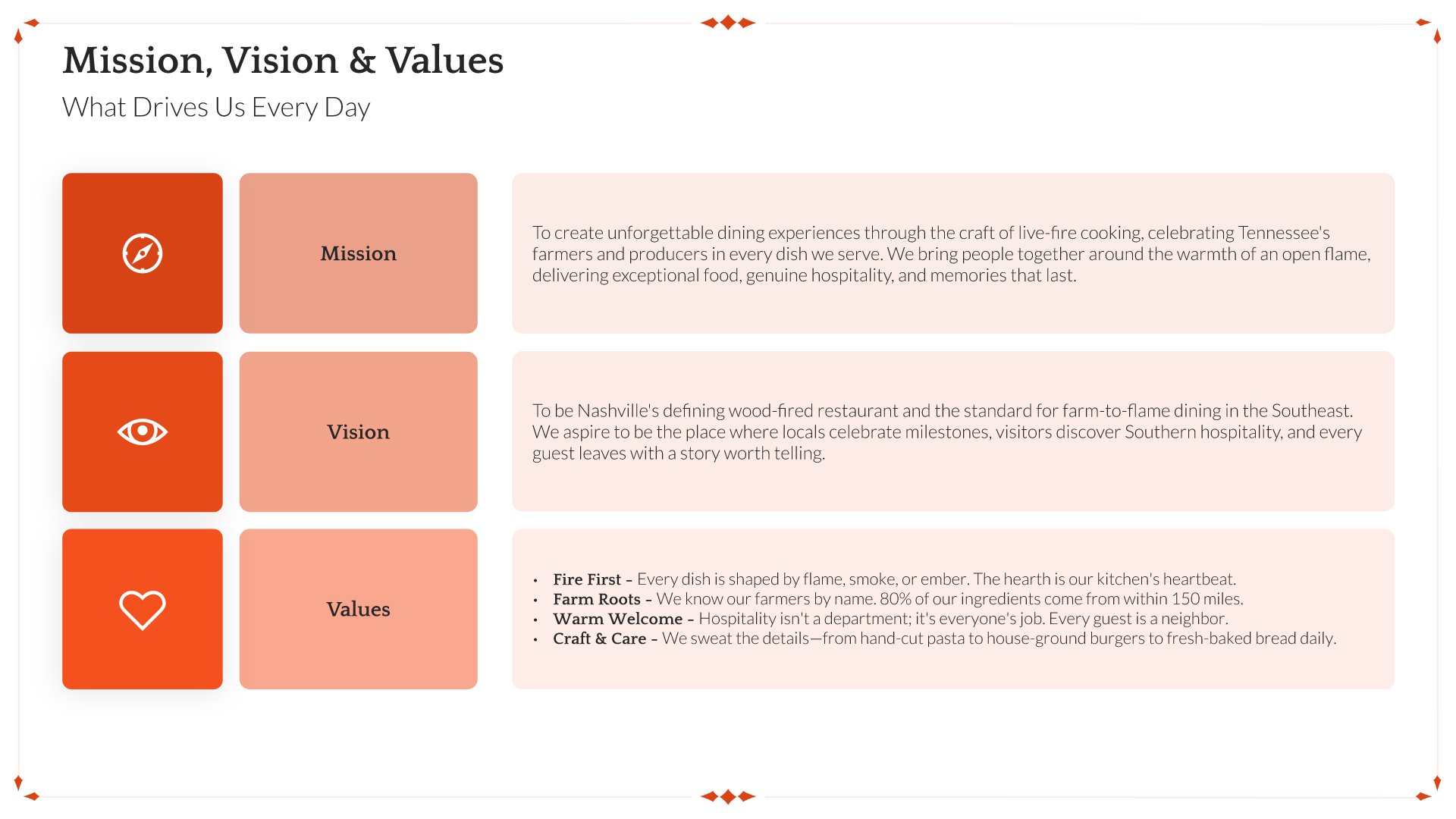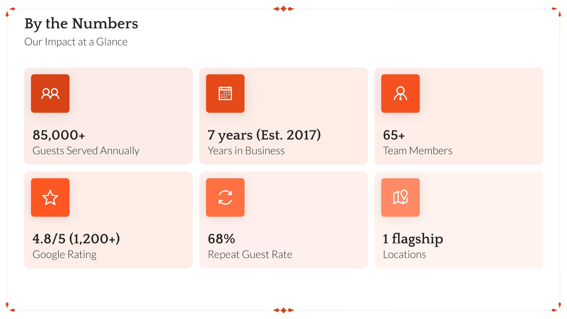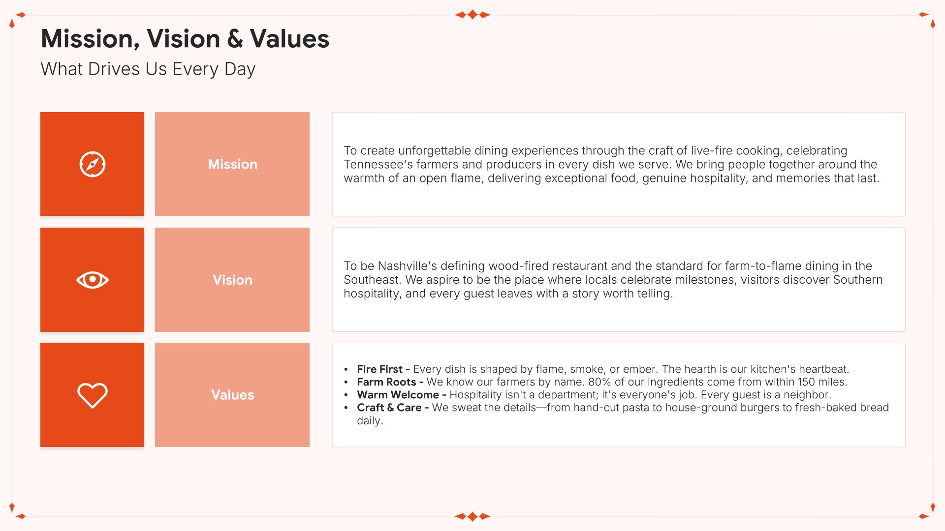 A professionally structured restaurant company profile template following the Universal Company Profile framework, the industry-standard structure for business introductions. Built for restaurants showcasing their concept to investors, partners, and clients. Covers story, journey, cuisine, dining experience, team, guest reviews, and recognition.