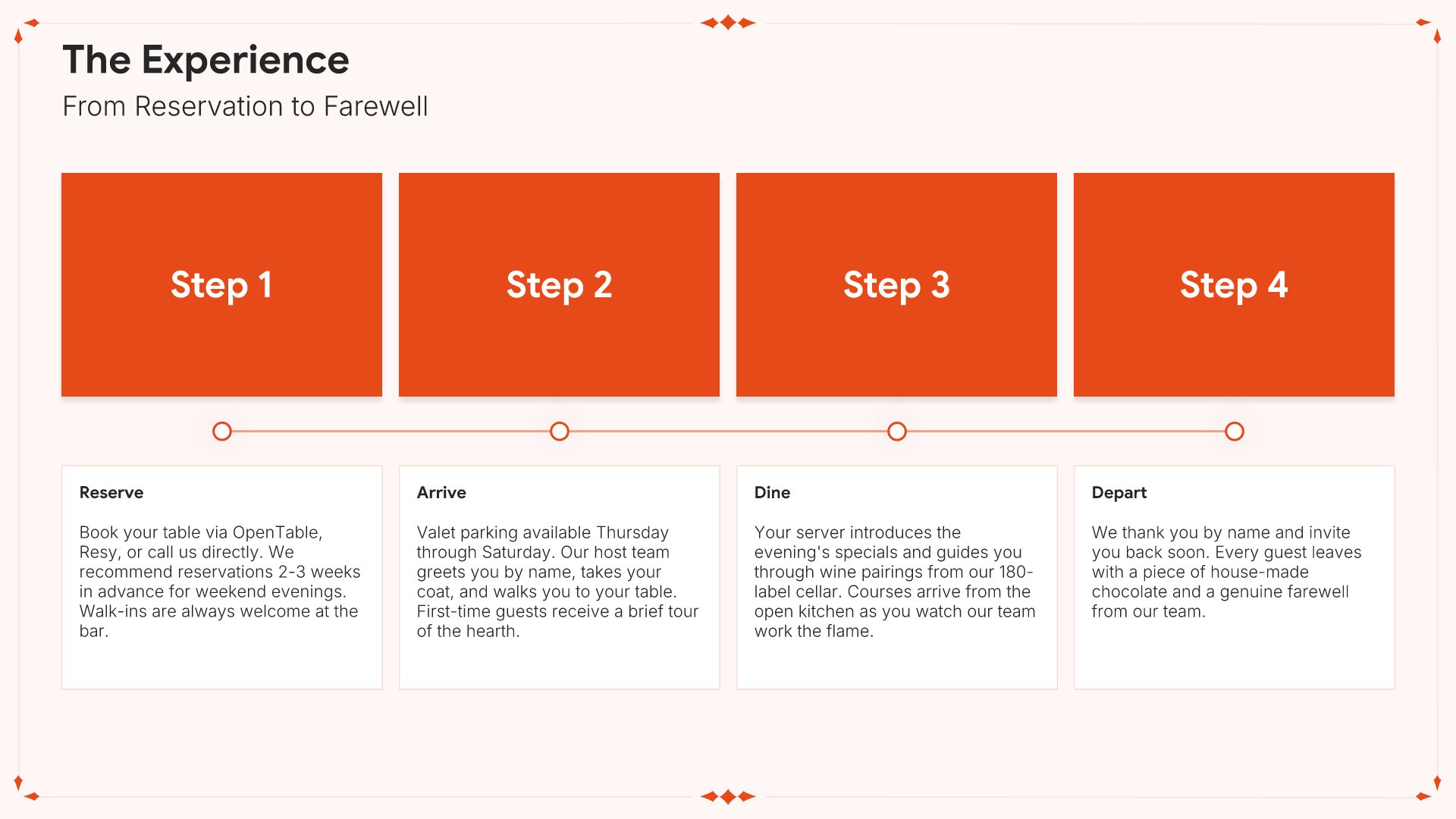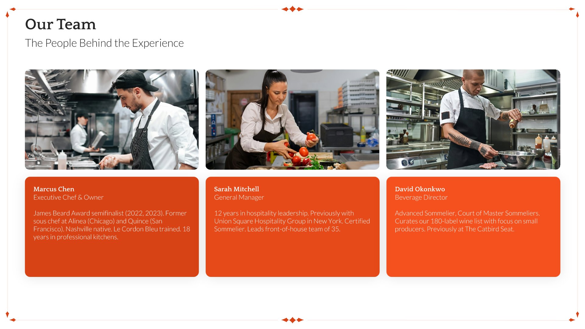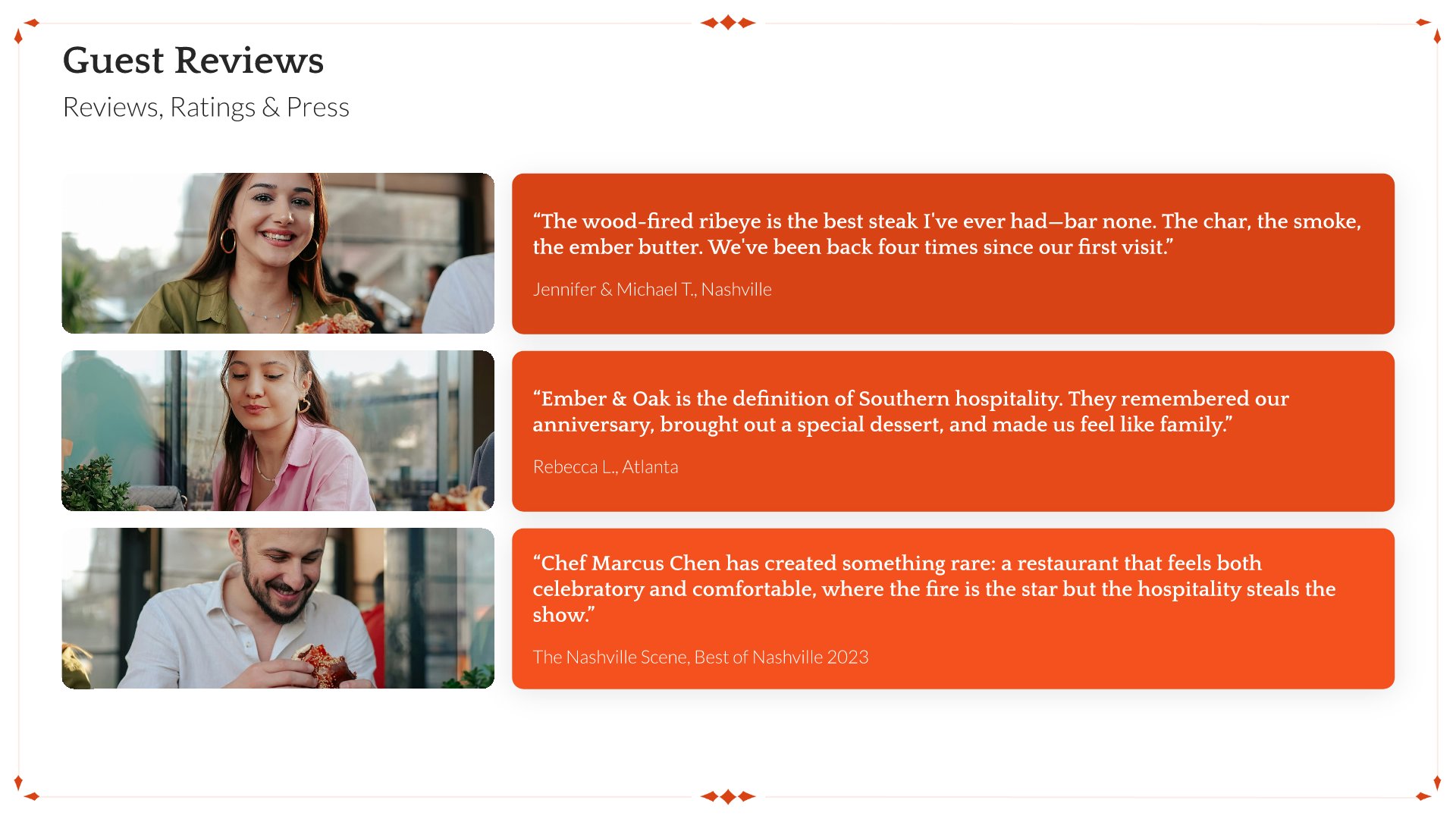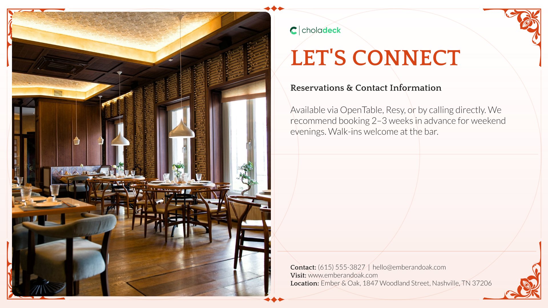 A professionally structured restaurant company profile template following the Universal Company Profile framework, the industry-standard structure for business introductions. Built for restaurants showcasing their concept to investors, partners, and clients. Covers story, journey, cuisine, dining experience, team, guest reviews, and recognition.