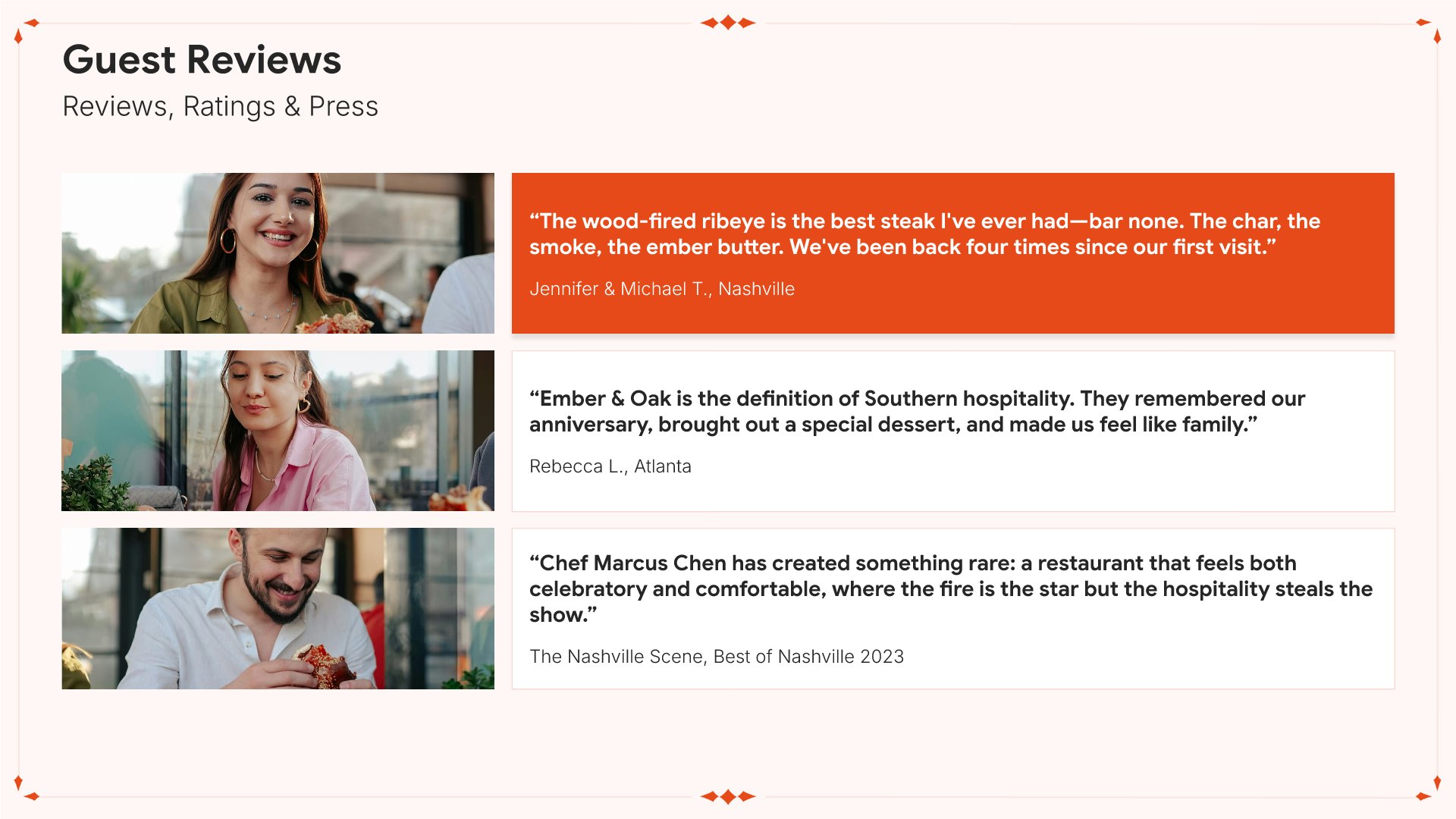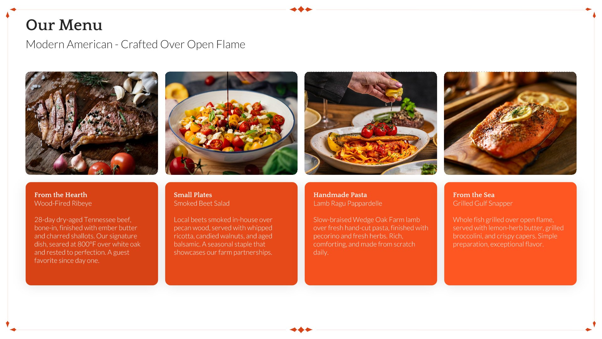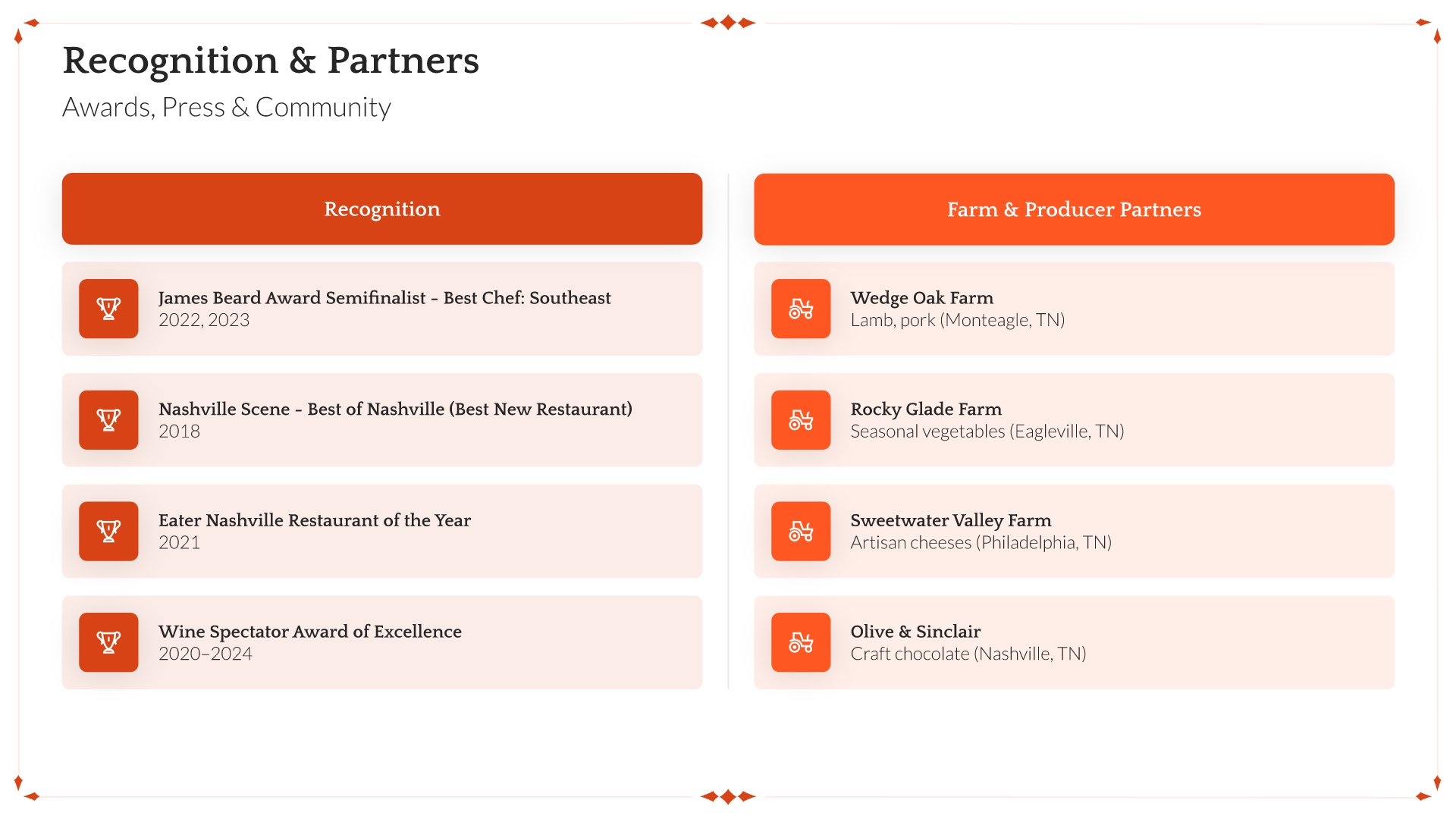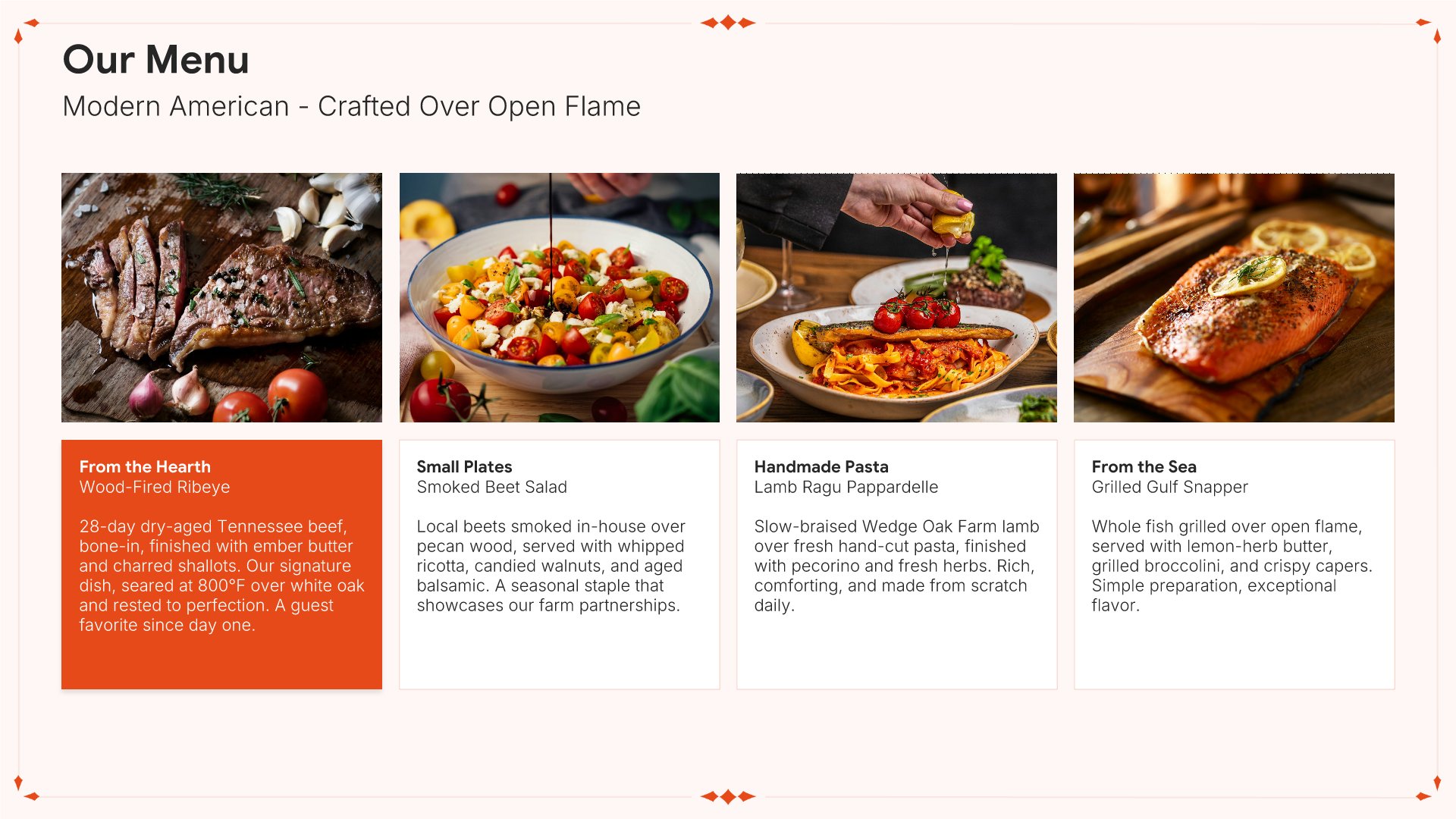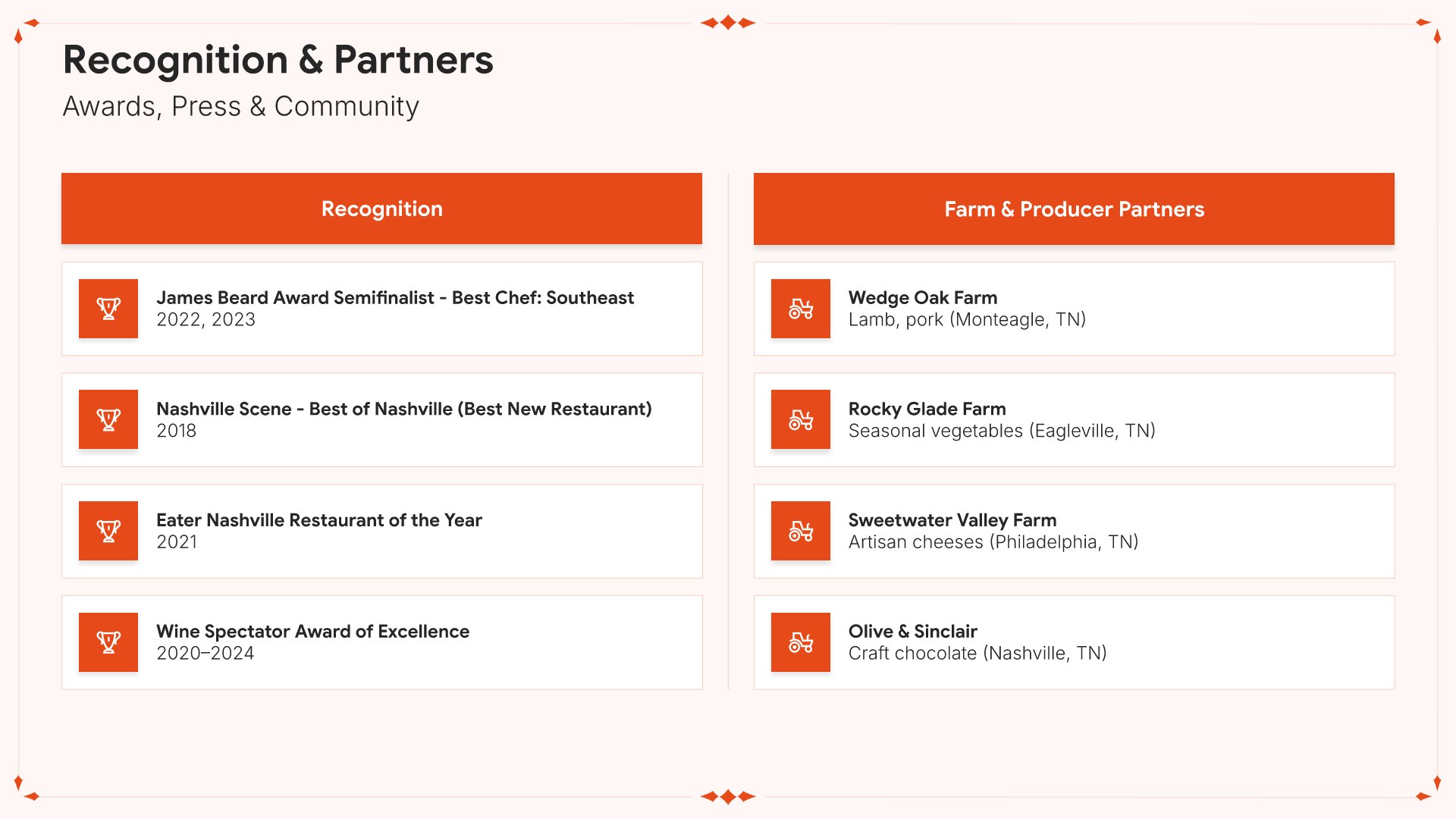 A professionally structured restaurant company profile template following the Universal Company Profile framework, the industry-standard structure for business introductions. Built for restaurants showcasing their concept to investors, partners, and clients. Covers story, journey, cuisine, dining experience, team, guest reviews, and recognition.