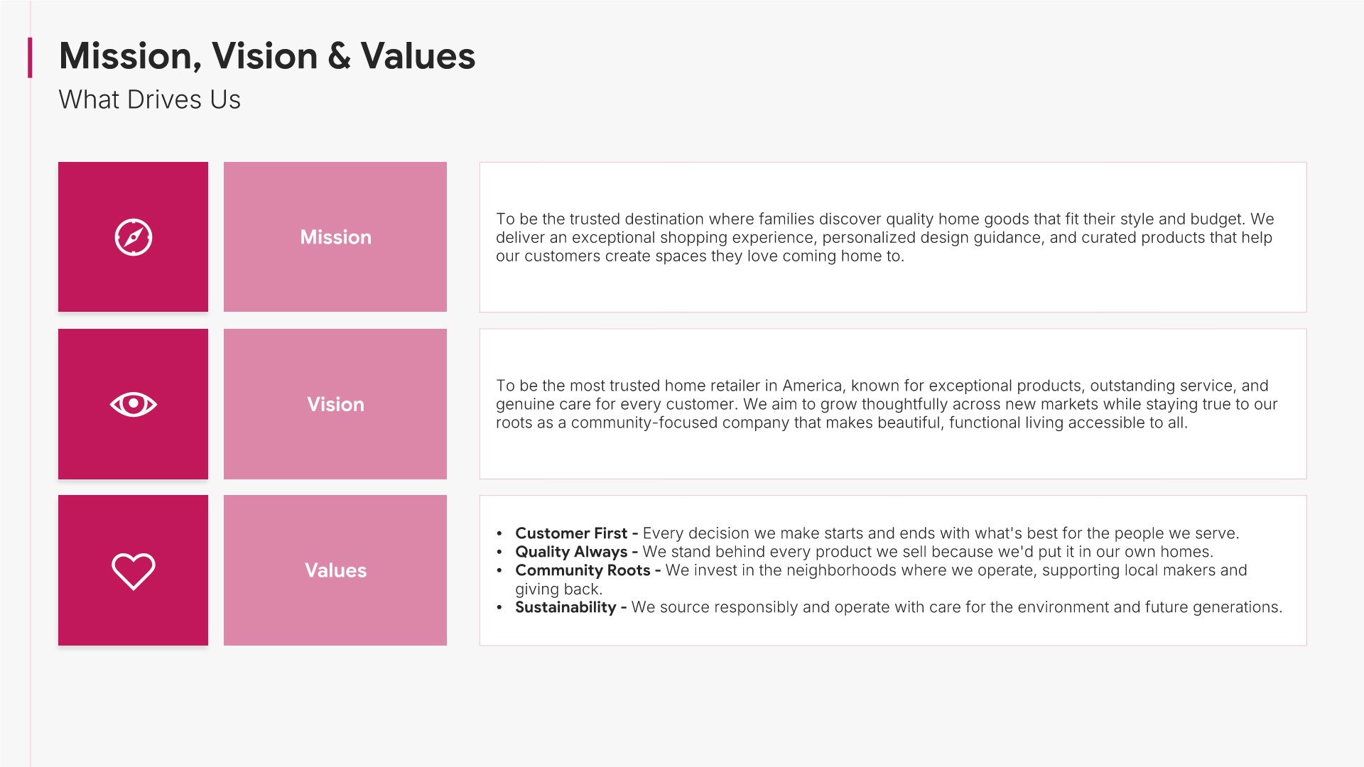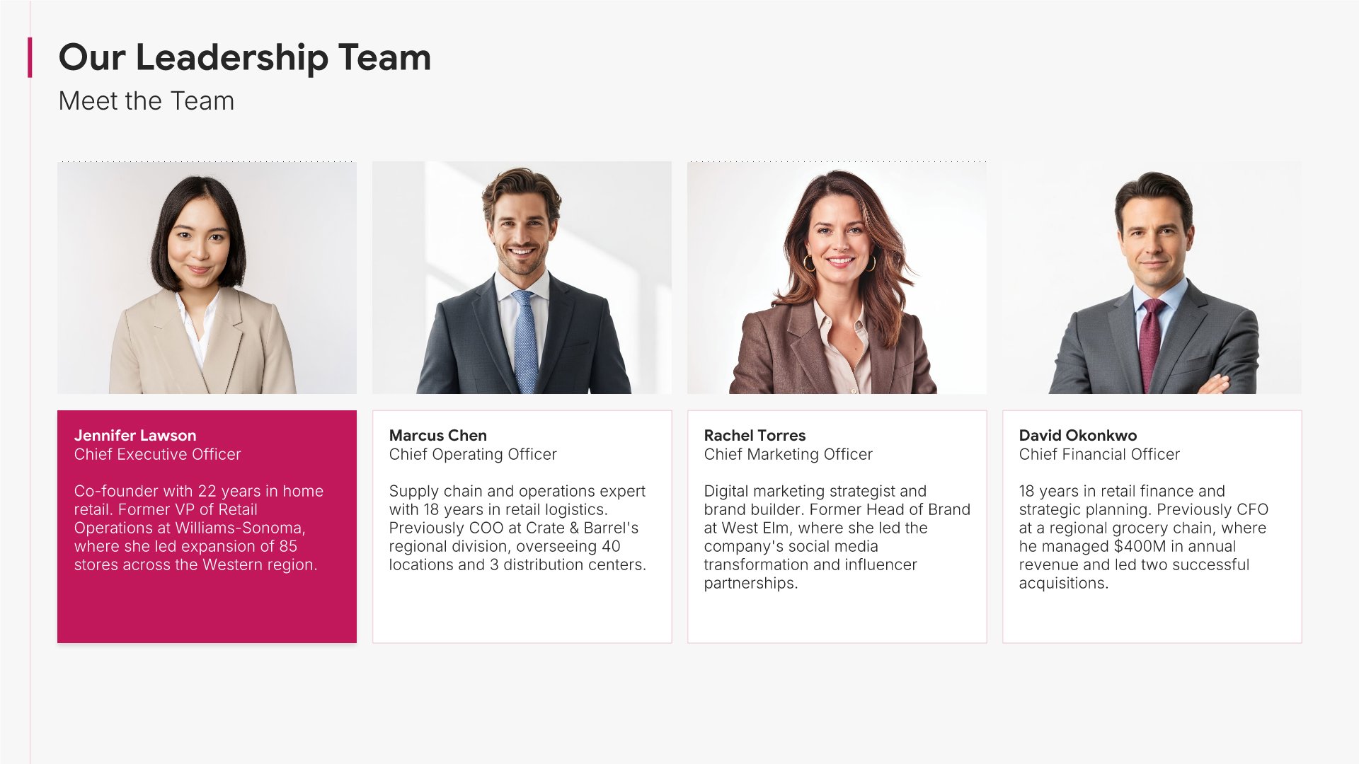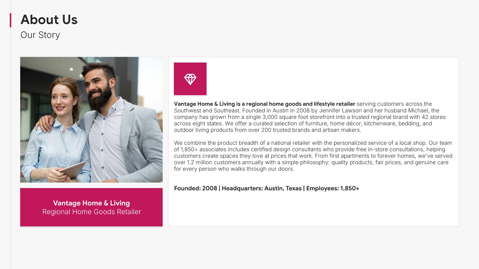 A professionally structured retail company profile template following the Universal Company Profile framework adapted for retail businesses. Built for retailers showcasing their brand to customers, partners, and investors. Covers company history, products, customer experience, locations, team credentials, testimonials, and brand partnerships.