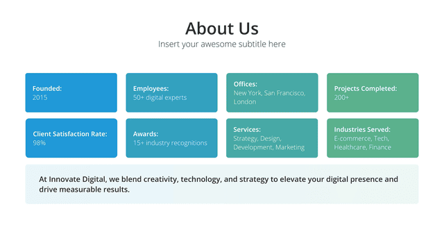Elevate your agency’s pitch with our expertly crafted Agency Presentation Template. Designed for impact and persuasion, this template offers a comprehensive framework to highlight your creative services, showcase your portfolio, and present successful client case studies. Each slide is strategically structured to demonstrate your agency’s expertise and unique value proposition, ensuring your presentation resonates with potential clients and partners.