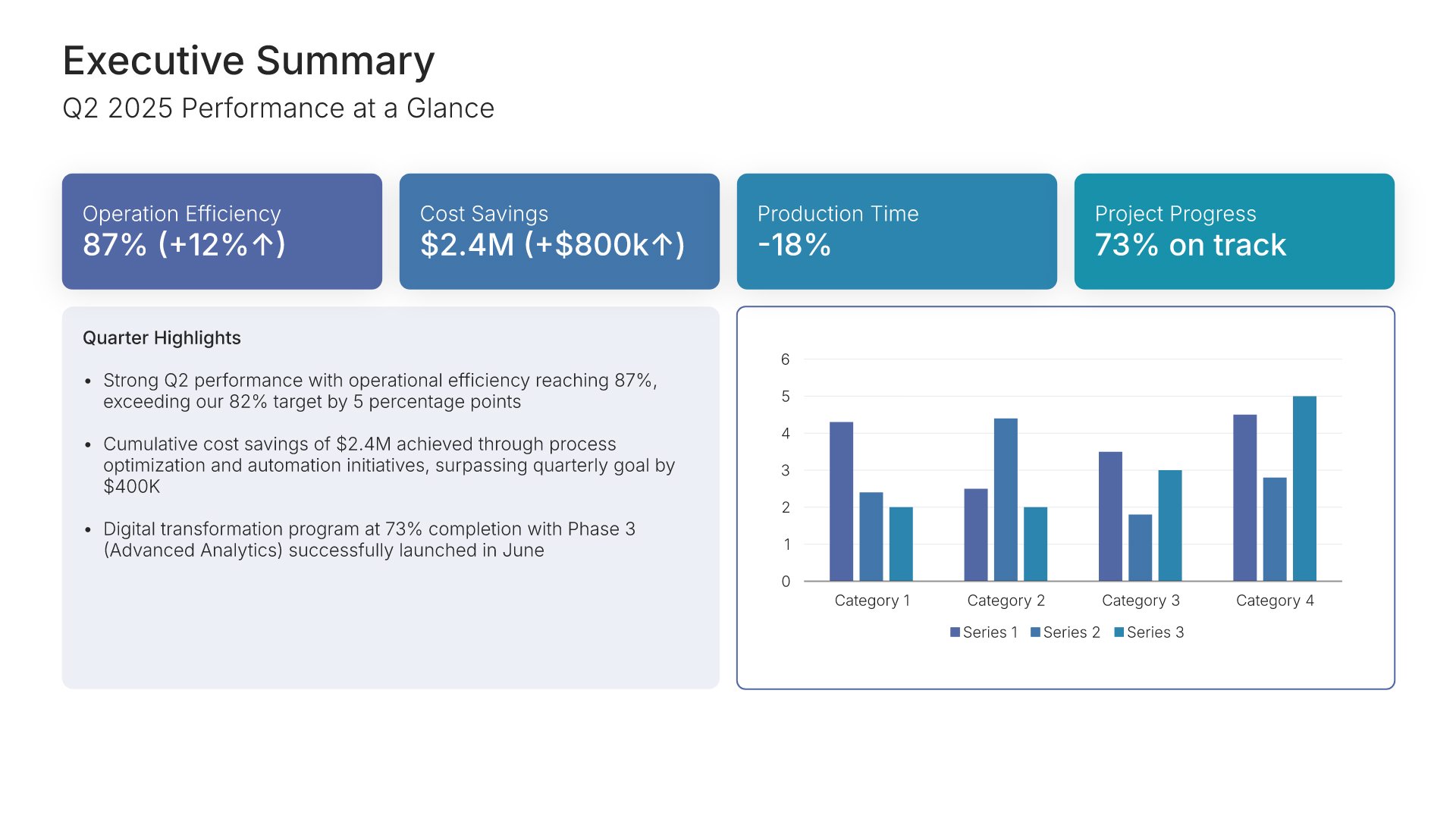 Executive summary slides help you present key points concisely for busy stakeholders. Use them to distill complex information into clear highlights, recommendations, and conclusions that can be understood at a glance. Ideal for board presentations, project updates, and any situation where decision-makers need the essential takeaways fast.