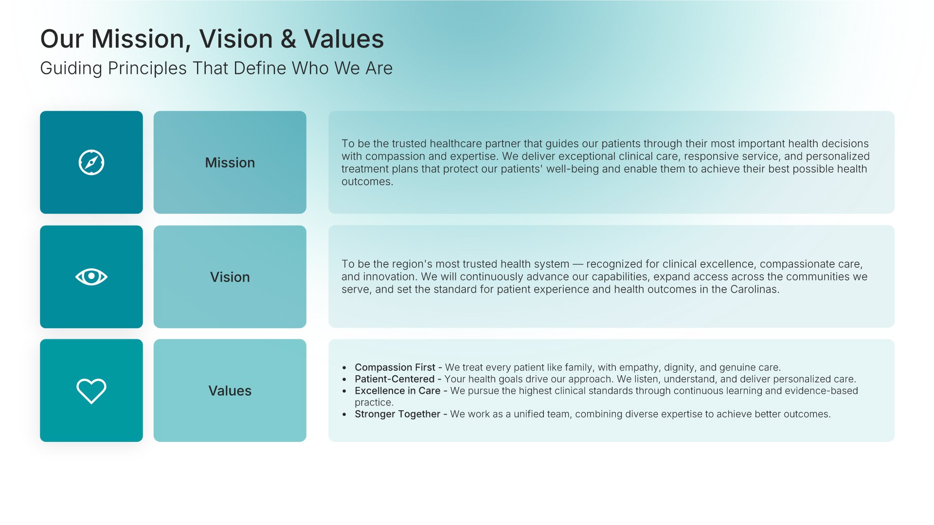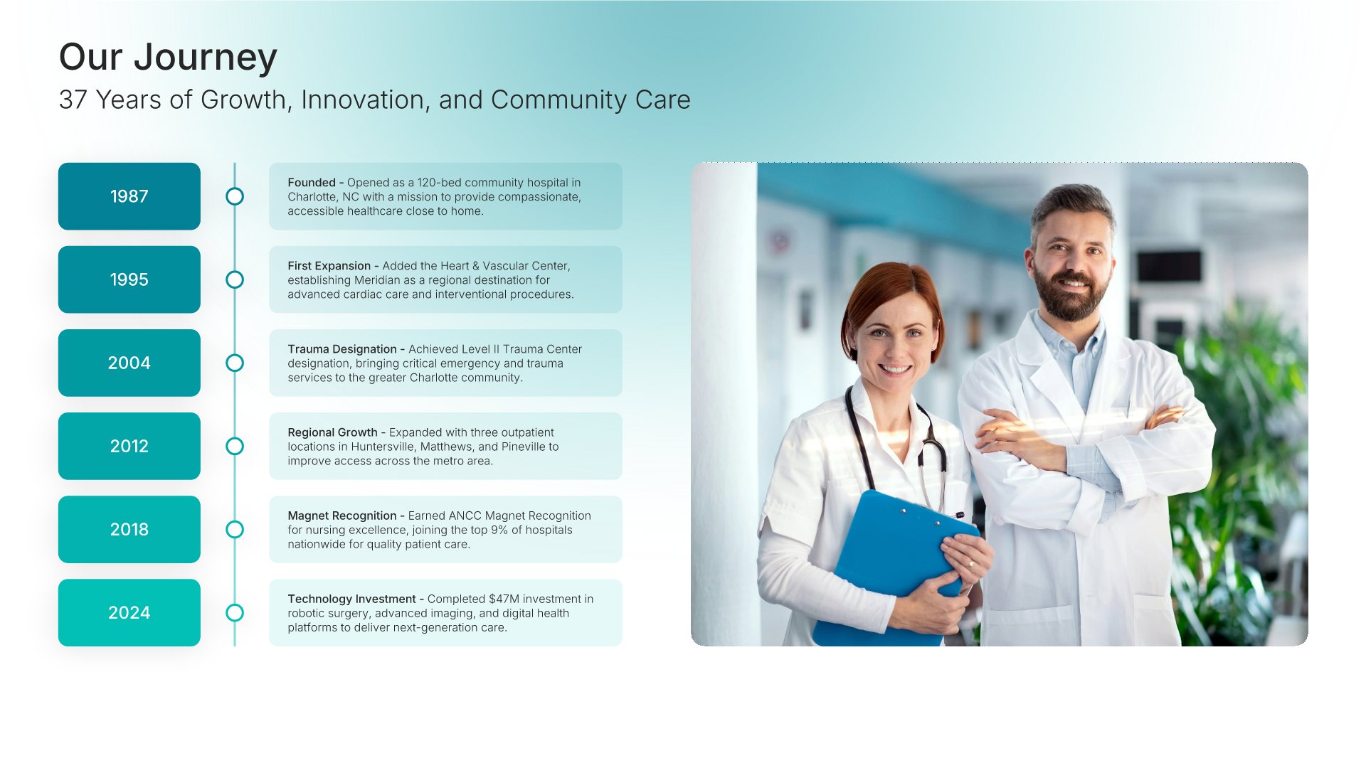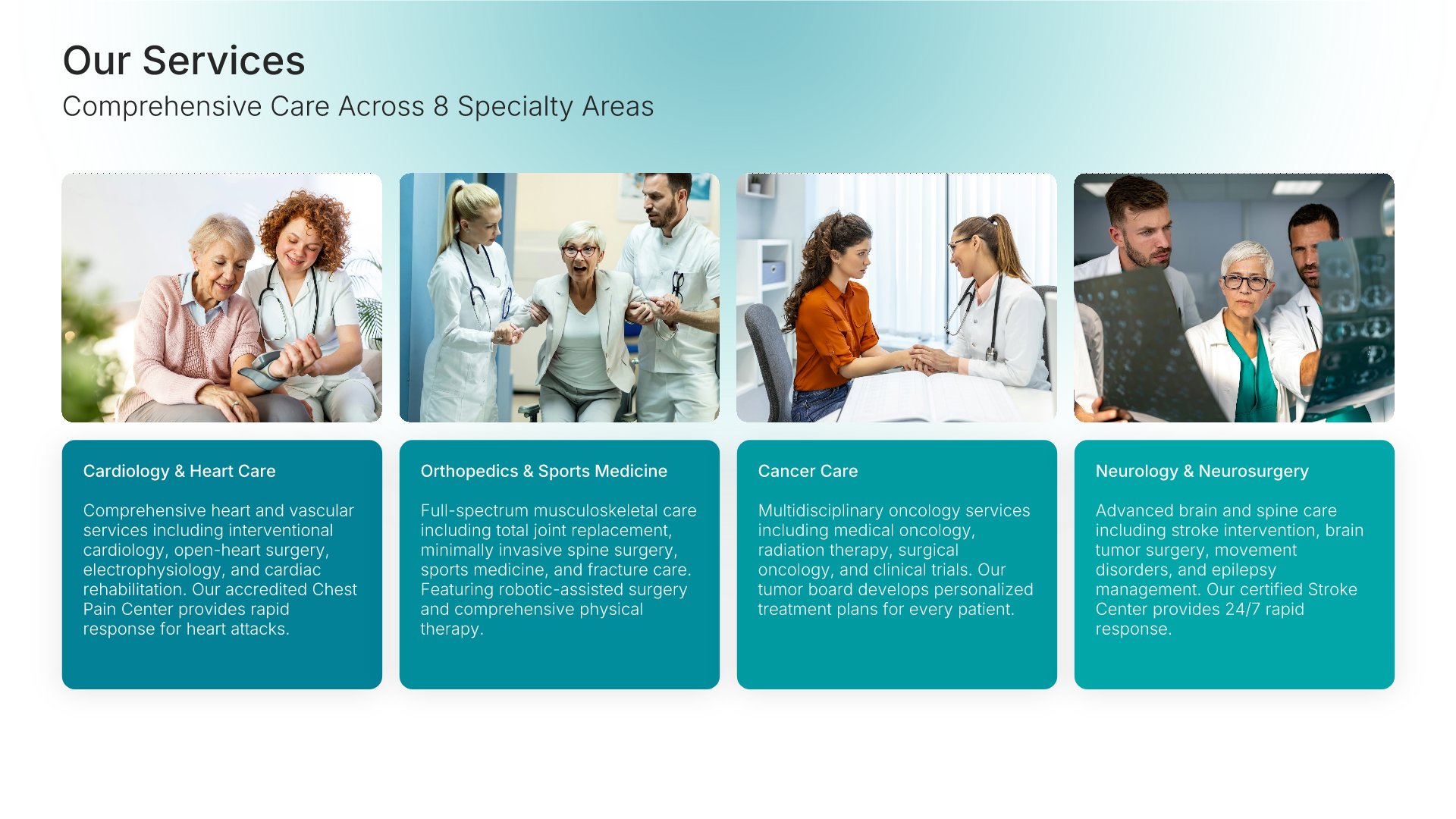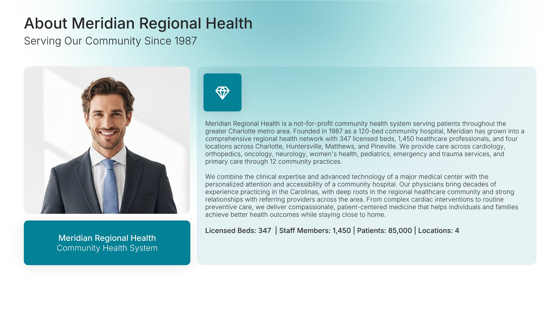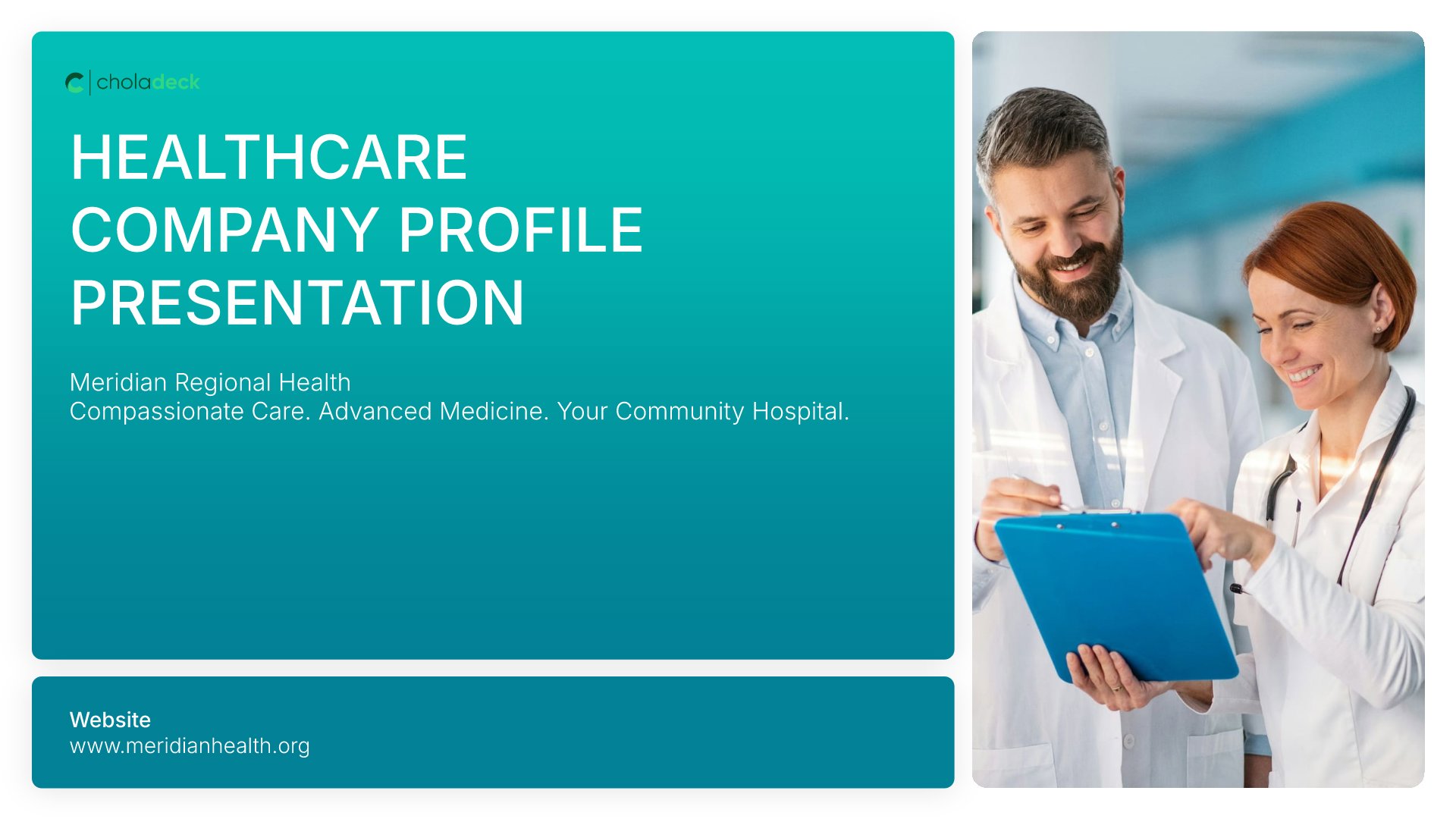 A professionally structured healthcare company profile template following the Universal Company Profile framework adapted for healthcare organizations. Built for hospitals, health systems, and medical groups showcasing their services to patients and partners. Covers history, services, facilities, care approach, team credentials, and accreditations.
